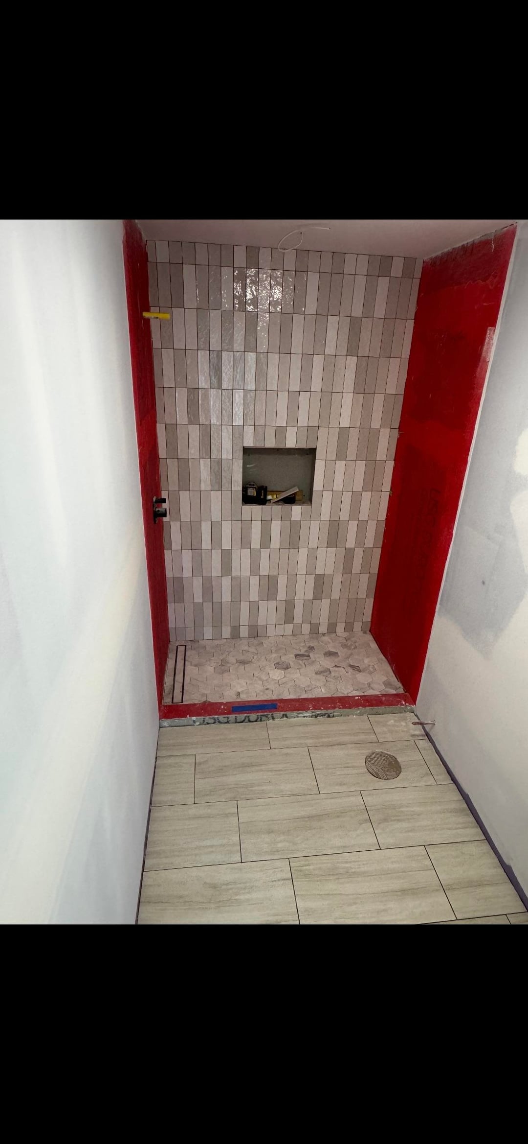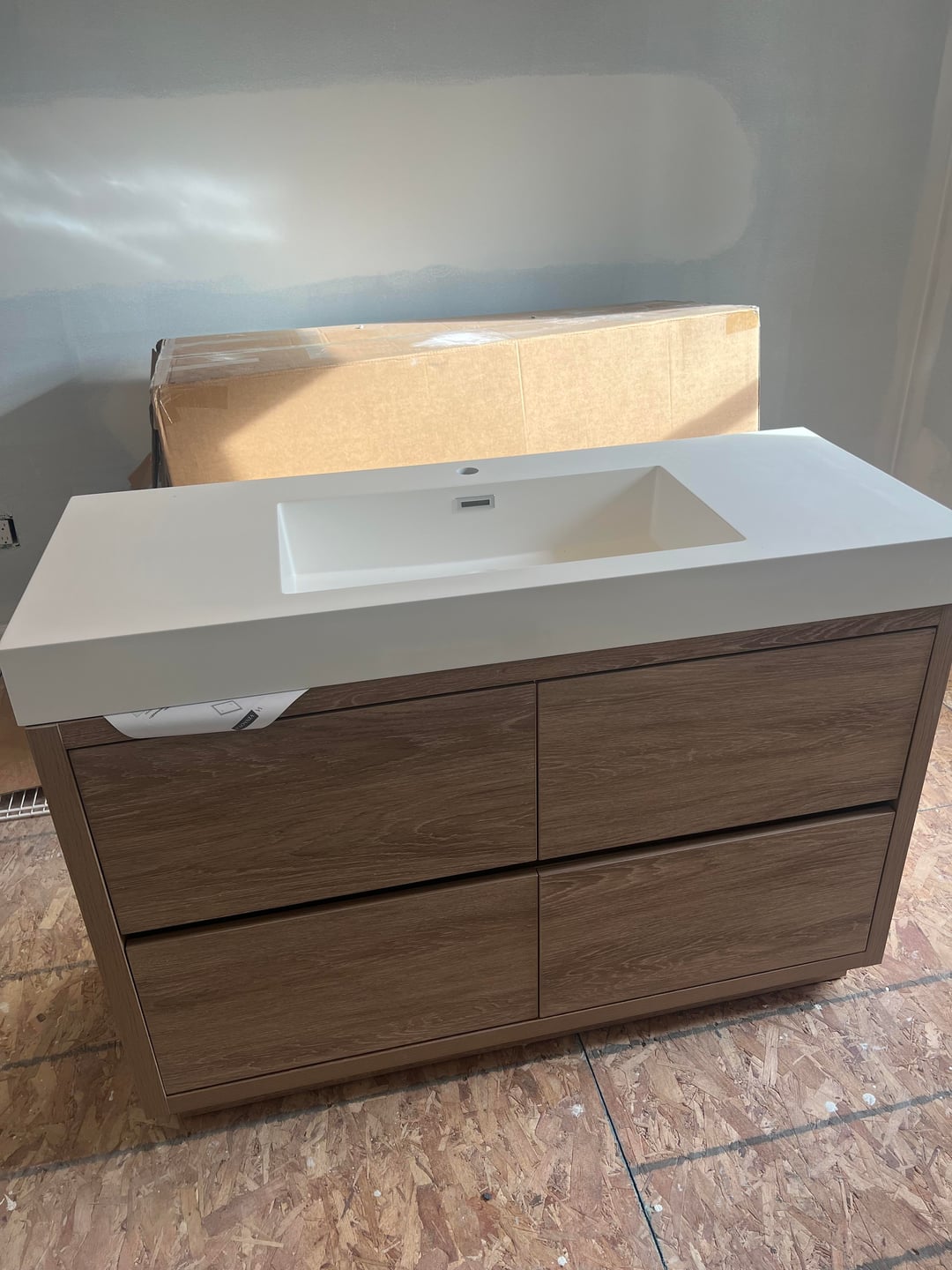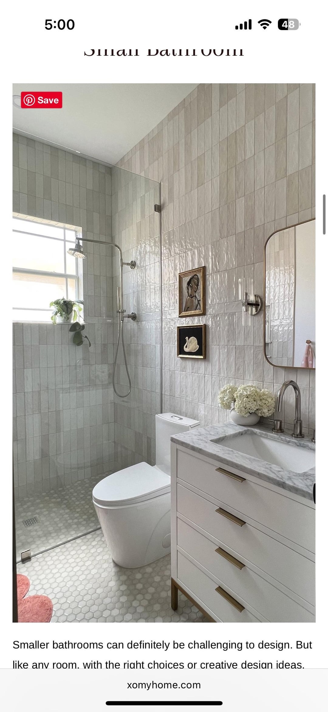 改造は大失敗だ!請負業者によって間違った色のタイルが選択され、設置されました。どうすればこれを修正できますか??実際のバスルームと洗面化粧台の写真が含まれています。私が目指していたもののインスピレーションの写真もそうです