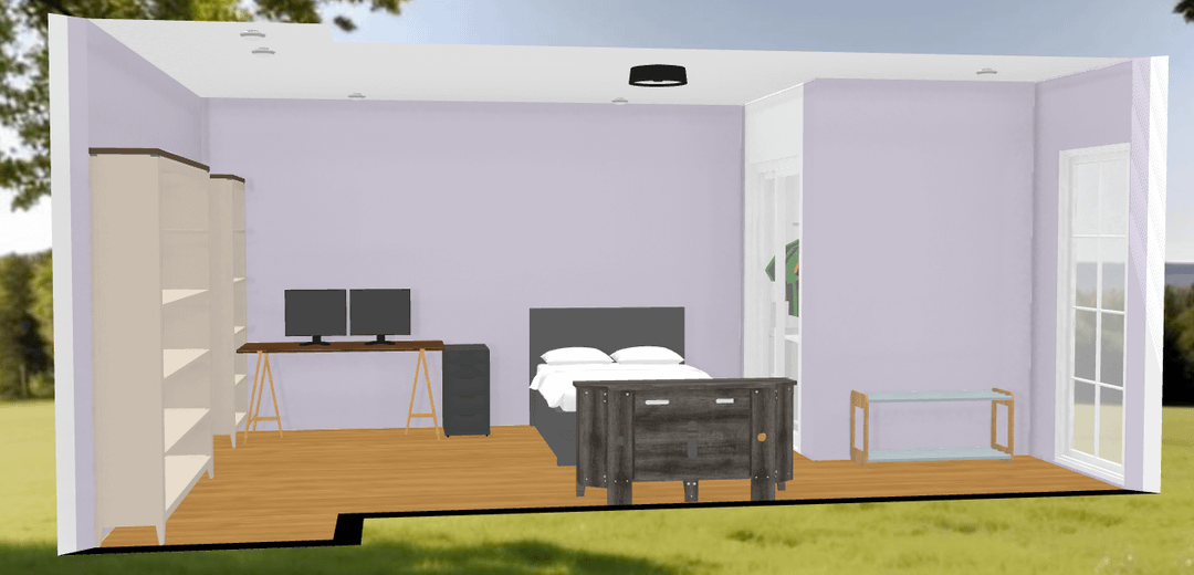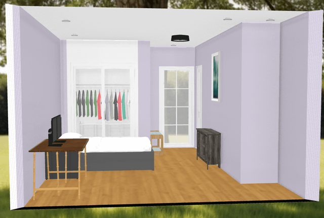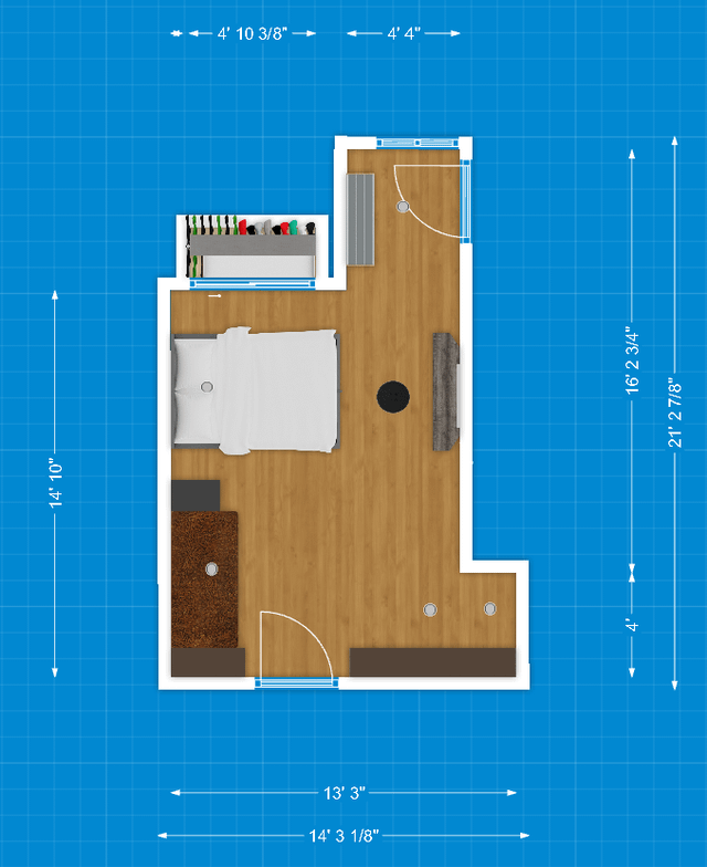 変わった形の寝室の収納とレイアウトのアドバイスを探しています。レンダリング ビューと寸法を含む 2D 平面図の両方を添付しました。