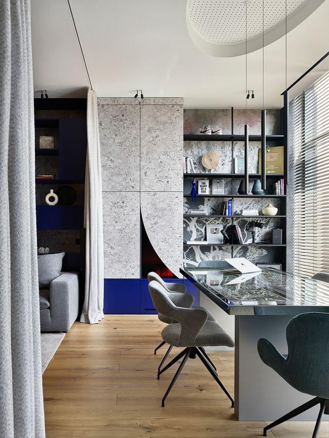 カスタムテラゾーキャビネット、ガラスデスク、オーク材の床を備えたワークスペース、スペイン、バルセロナ [640×853]