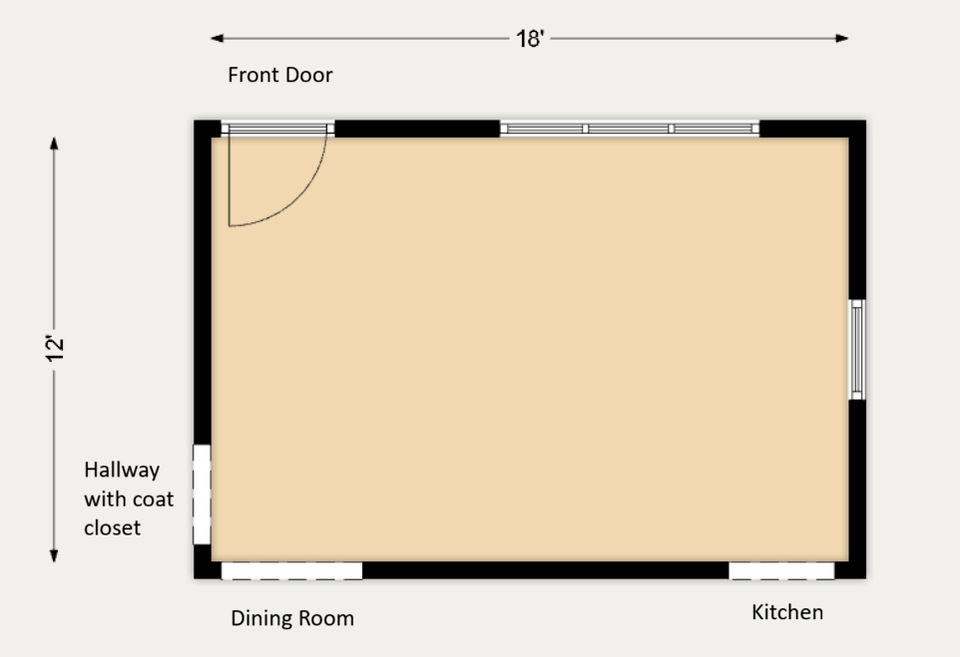 最初の写真は家具のない部屋です。 2 番目の写真は現在のレイアウトの大まかなモックアップですが、大きな窓に面したソファが表示されているものより少し大きいため、家具の縮尺は完全に一致していません。