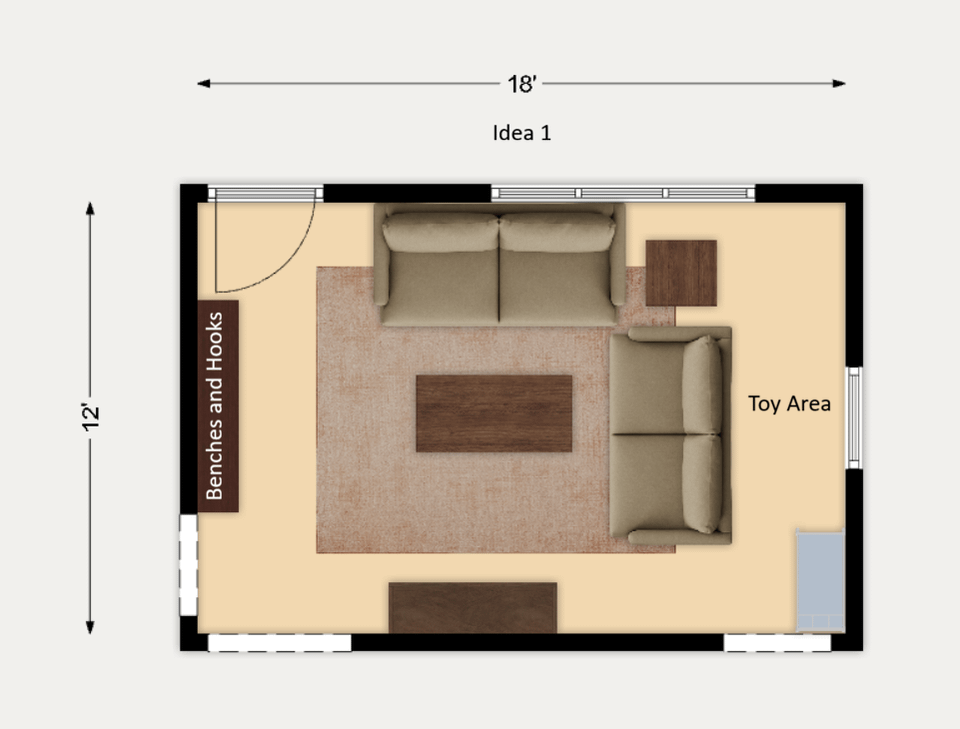 • アイデア 1 は、廊下の入り口のある壁にドロップ ゾーンを置き、家具を移動して (ソファを 2 つ置いてありますが、壁に接していない方のほうがうまくいくのであれば削除することもできます)、小さな窓のある壁におもちゃの収納スペースを増やすことです。