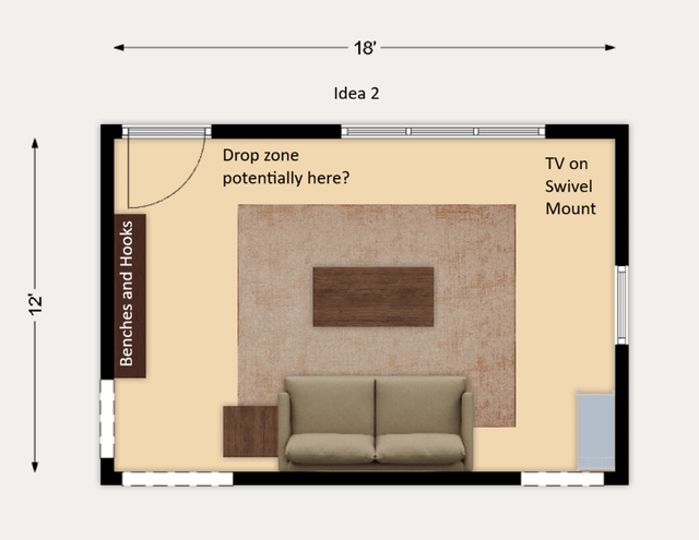 • アイデア 2 は、部屋の向きを完全に変更し、部屋に入ったときにソファが見えるようにし、テレビを隅に置くことです。そうすることで、ドアと大きな窓の間の場所がドロップゾーンになるようになります。