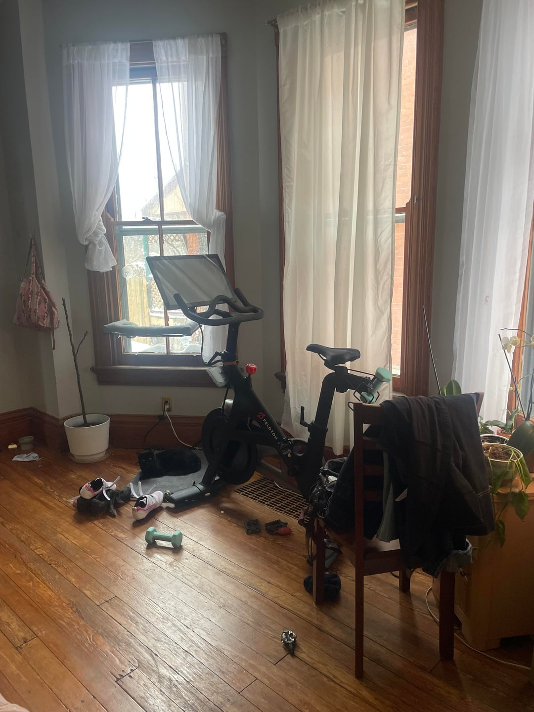 リビングルームの面積で行き詰まっています。今週、スピンバイクを置くためにリビングルームの配置を変えました。それは私の机/オフィススペースを取り除くことを意味しました。私たちはしばらくこのスペースに住んでおり(したがって、散らかっています)、リビングエリアに新しい家具を調達し始めるための資金が得られました。このスペースに収容したいもの: