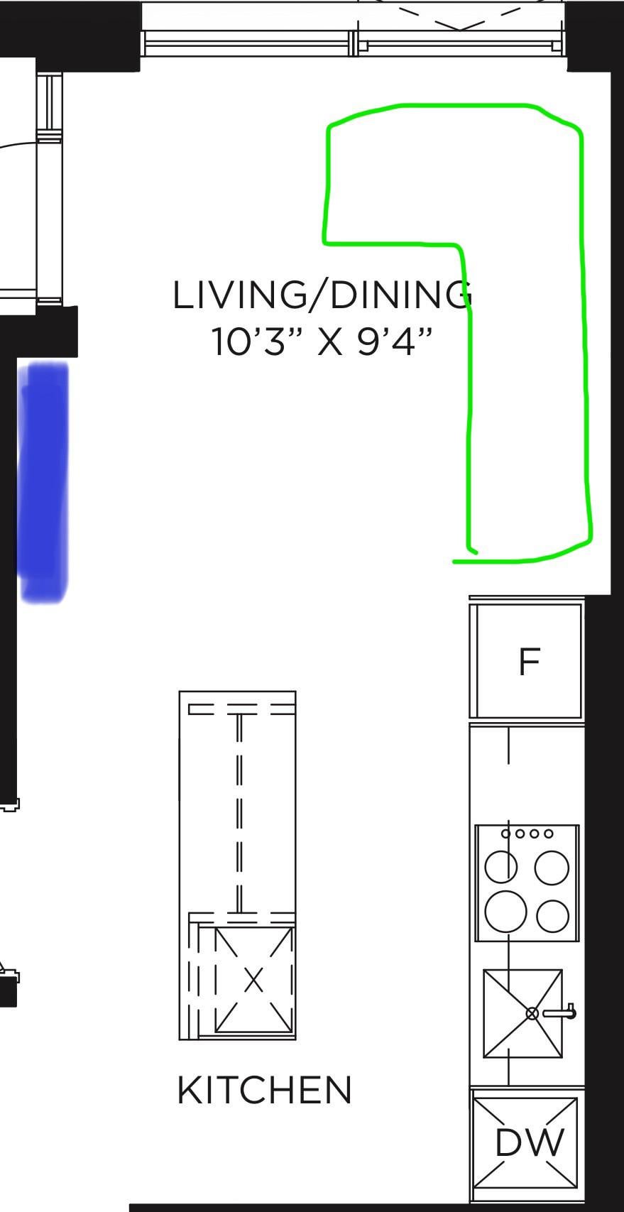 距離だけを考えると、65 インチが良さそうですが、そのサイズは青い領域に対して大きすぎるのではないかと心配しています。スペースの「キッチン」の半分を深く侵食しすぎないでしょうか? 55 インチの方が良いかもしれません。