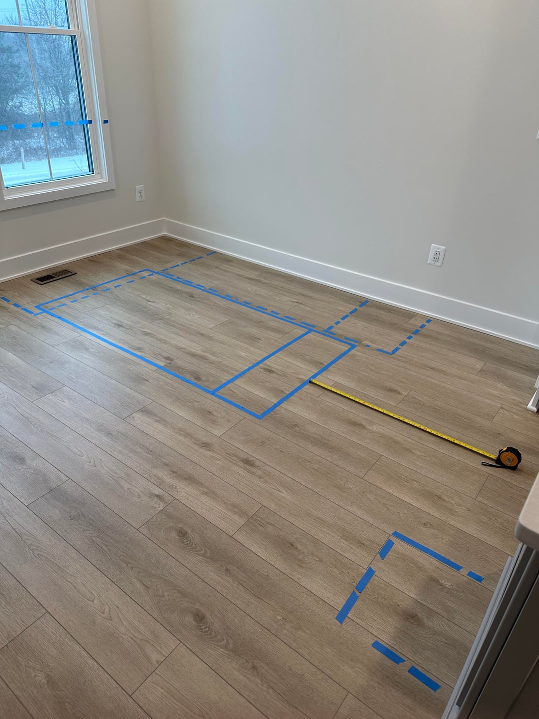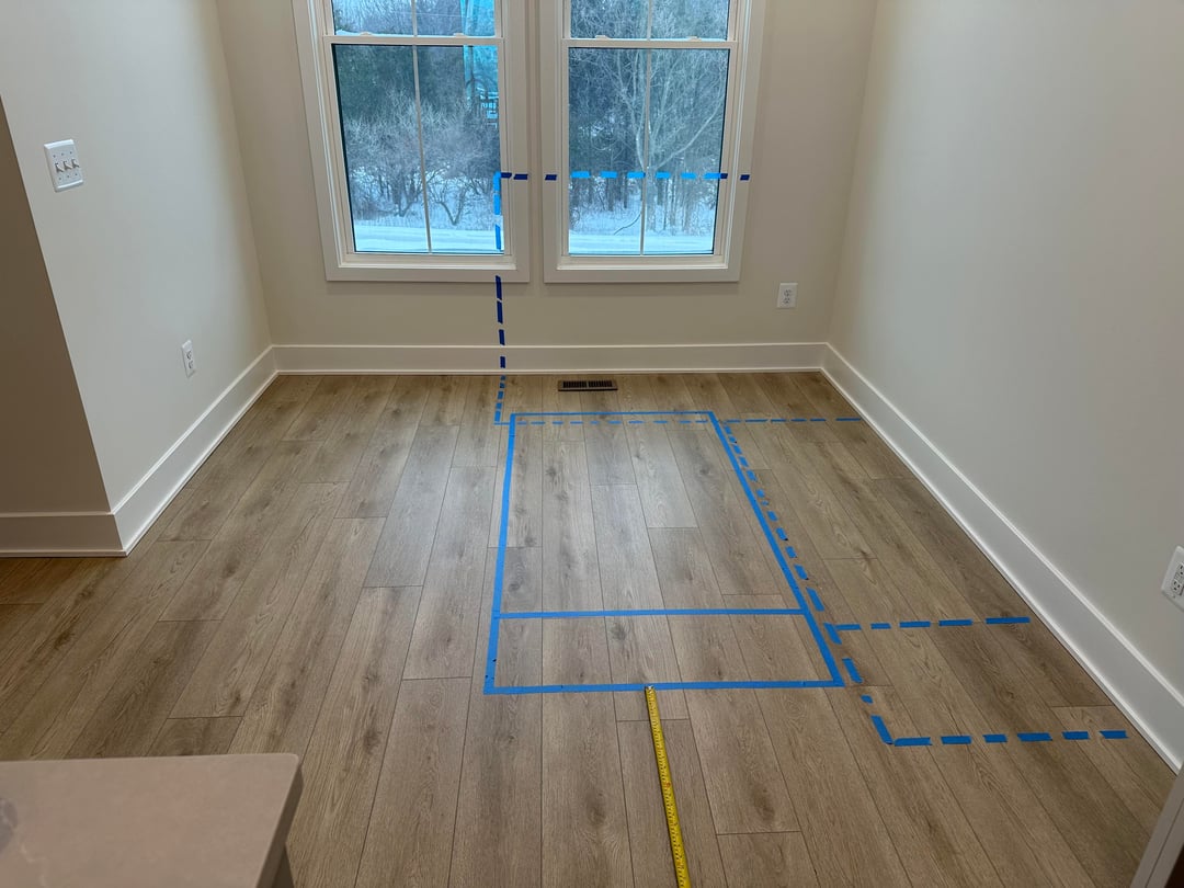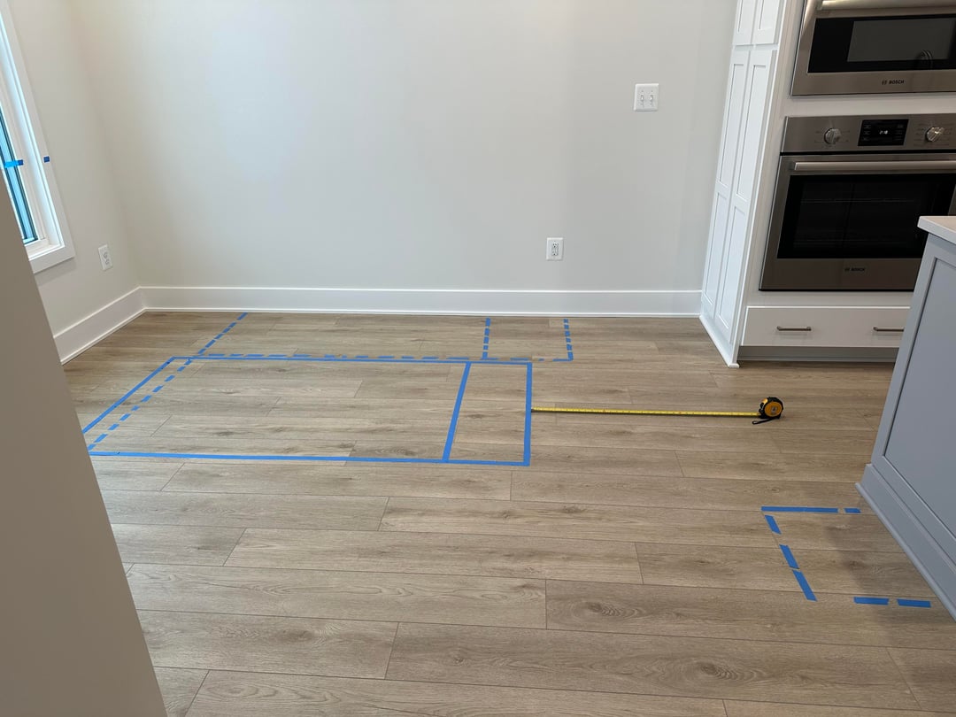 私のダイニングルームは今のところ完全に空です。点線は長椅子を表し、実線はダイニングテーブルを表します。