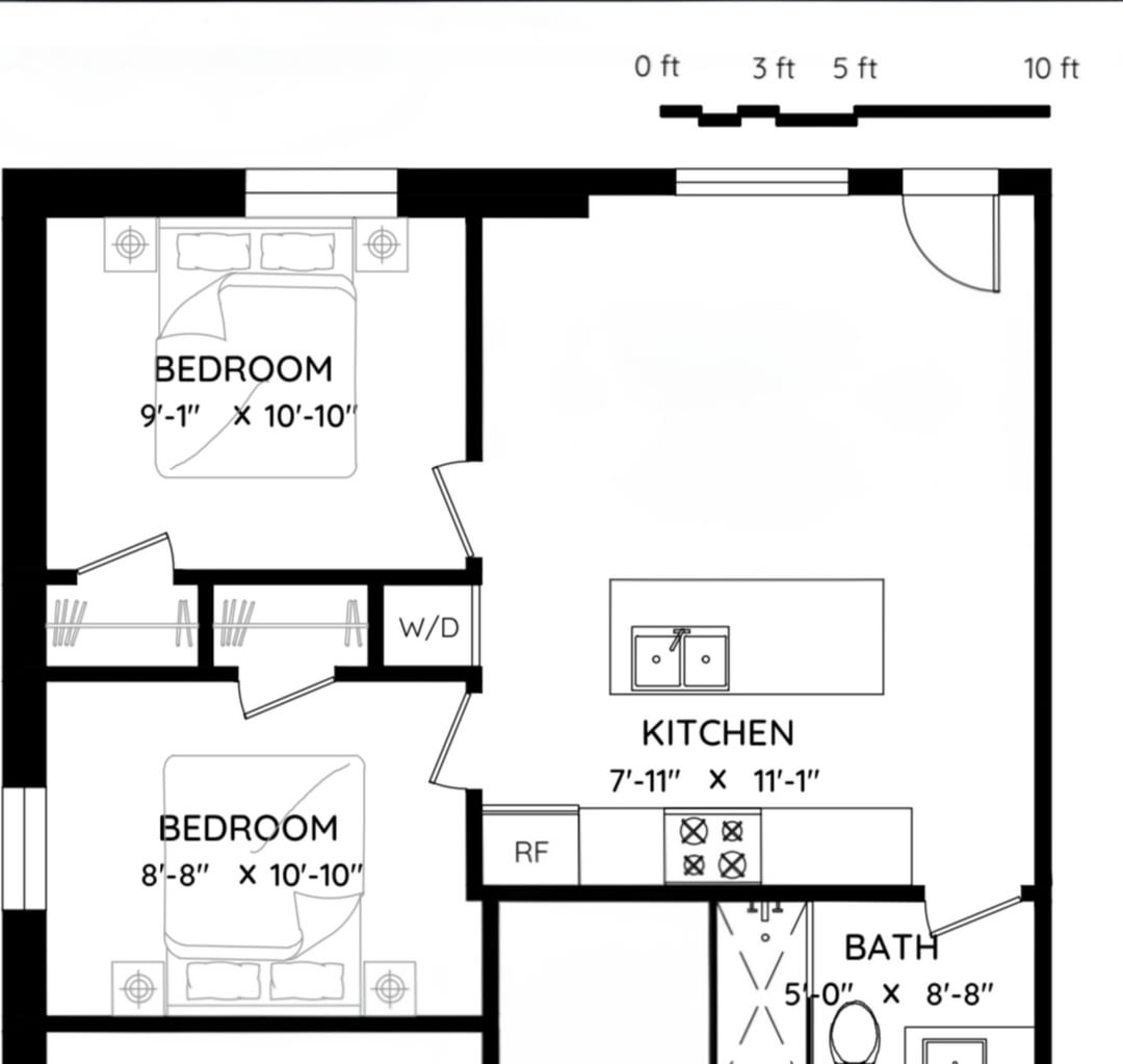 今考えているのは、壁(寝室左上)にテレビを置くことです。コーヒーテーブルを置かずに、テレビの近くにソファを置きます。次に、ドアと通路をふさがないように、ソファの後ろに「ダイニング」テーブルを置きました。このテーブルは、入口/出口テーブルとしても機能します。ダイニングテーブルをやめてアイランドキッチンにしようかとも考えたのですが、カウンターのスペースが限られているのでそれはもったいないですね。