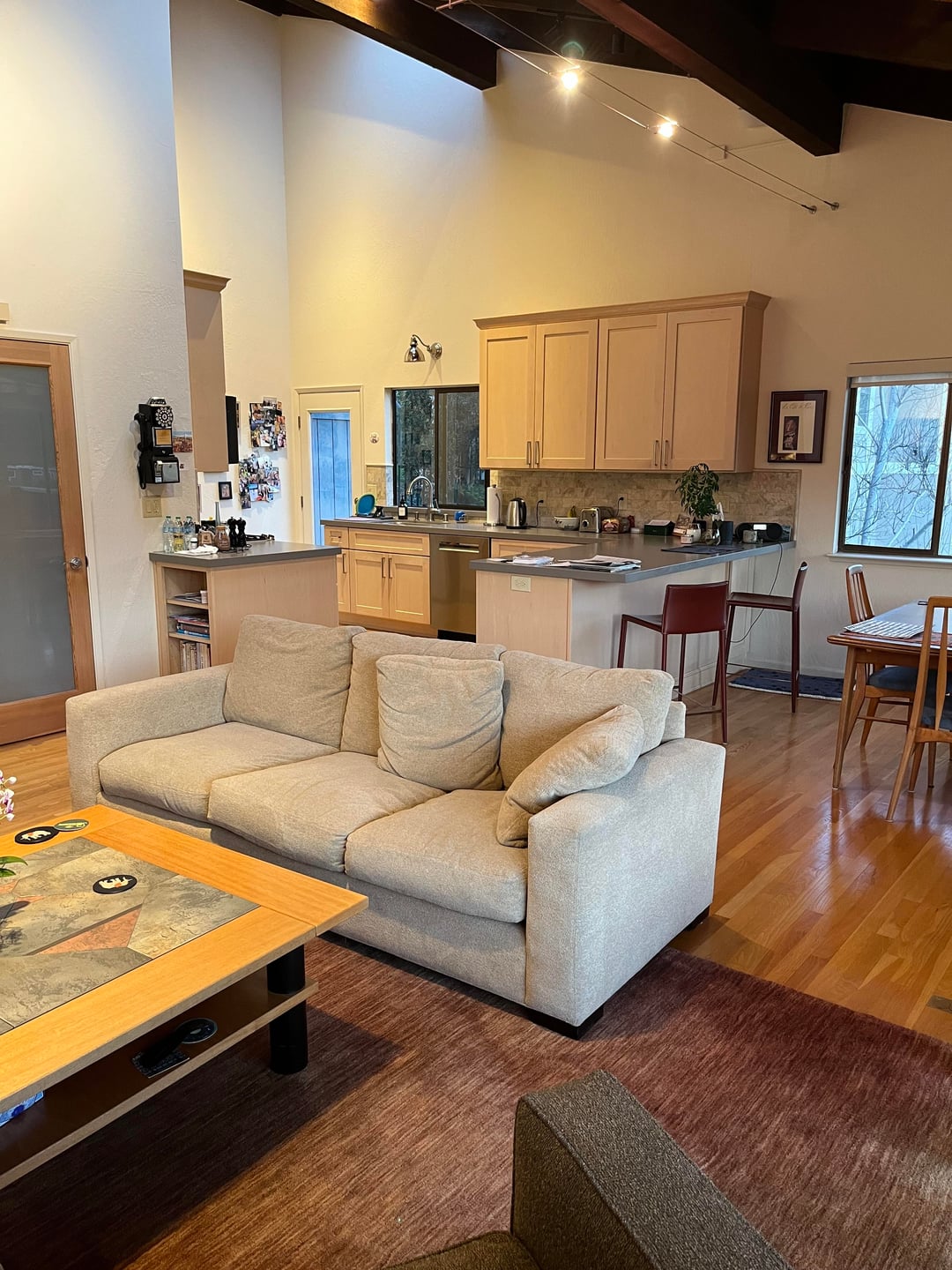 しかし、ある家族は、この配置だと部屋が完全に分断され、ソファに座る人が後ろ向きにキッチンを向いているなど、社交が難しくなると考えています。私たちは新しい家具、新しい敷物、アートワークを手に入れる準備ができているので、現在の作品は主に配置例です。 (ただし、提案は大歓迎です!)