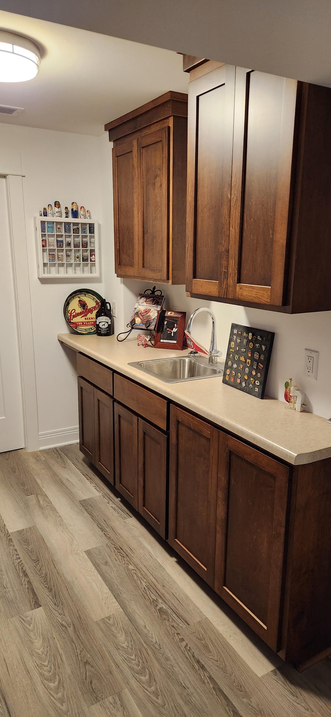 うちの地下室には簡易キッチンがあるので、もしそれを義母専用のスイートに変えたいと思ったら。私たちにはそうする気はありません。今は収納のみですが、他の用途も考え中です。電気接続を備えた標準サイズのレンジを置く場所がありますが、設置する予定はありません (写真 2 に追加の椅子があります)。冷蔵庫を置こうと思ったけど、調理室は36しかない" カウンターからカウンターまで広いので、冷蔵庫を置くとそのスペースは本当に狭くなります(そこに収まるカウンター奥行きの冷蔵庫が見つからない限り)。