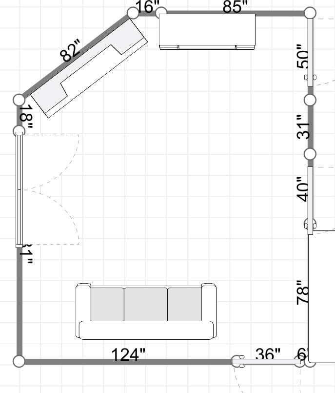 最近引っ越してきたのですが、このリビングルームのレイアウトをどうしたらいいのか分かりません。カウンターを挟んで右手にキッチンがありオープンです。このアプリの使い方がわからなかったため、開口部が外側開きのドアになっています😅。スイング式のフレンチドアは実際にそこにあります。うちには古いソファとエンターテイメントユニットがあります。なぜなら、ここに何が収まるのか見当もつかないからです。私たちにはデザインの視点がまったくありません。私の夫は暖炉の上のテレビに非常に反対しているので、小さな壁が基本的に唯一の選択肢です。私が主に気にしているのは、どのような形/サイズのラグを入手するかです。暖炉のせいで何も収まりそうにない。アドバイスをいただければ幸いです。