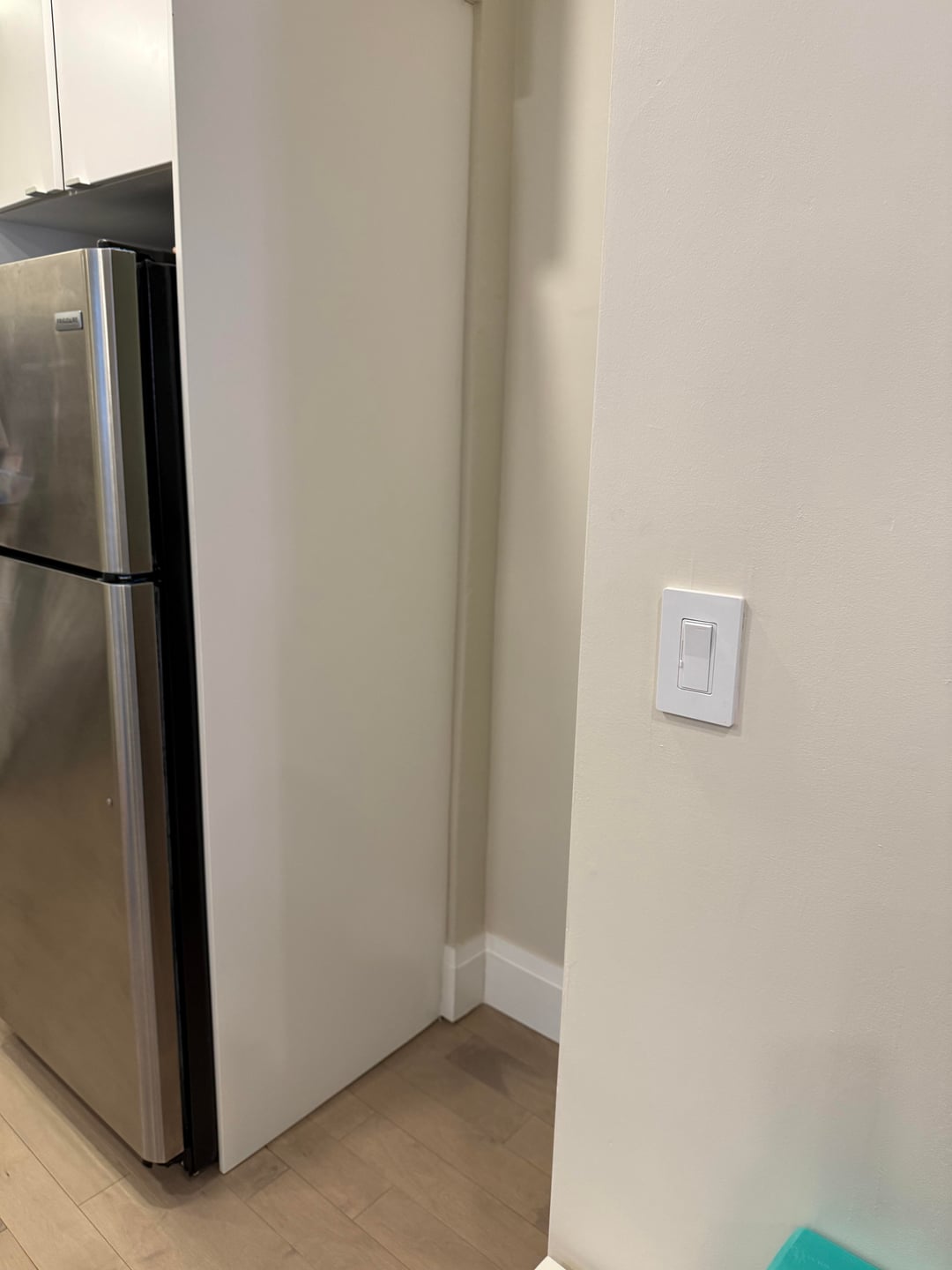私のアパートのキッチンとリビングルームの間に、この厄介な隅があります。右側の隅の中に、収納クローゼットがあります。このスペースを使用して、掃除機、モップ、小さなキッチン家電などの機能的なアイテムを保管したいと考えています。装飾品かもしれませんが、きちんとした方法で、収納クローゼットの入り口を完全にブロックすることはありません。棚、本棚、ラックを考えています。必要に応じて、背面の塗装された壁に穴を開けることはできますが、冷蔵庫に沿った白いキャビネットには穴を開けません。見た目が良くて機能的に意味のあるものは何なのかわかりません。助けてください。