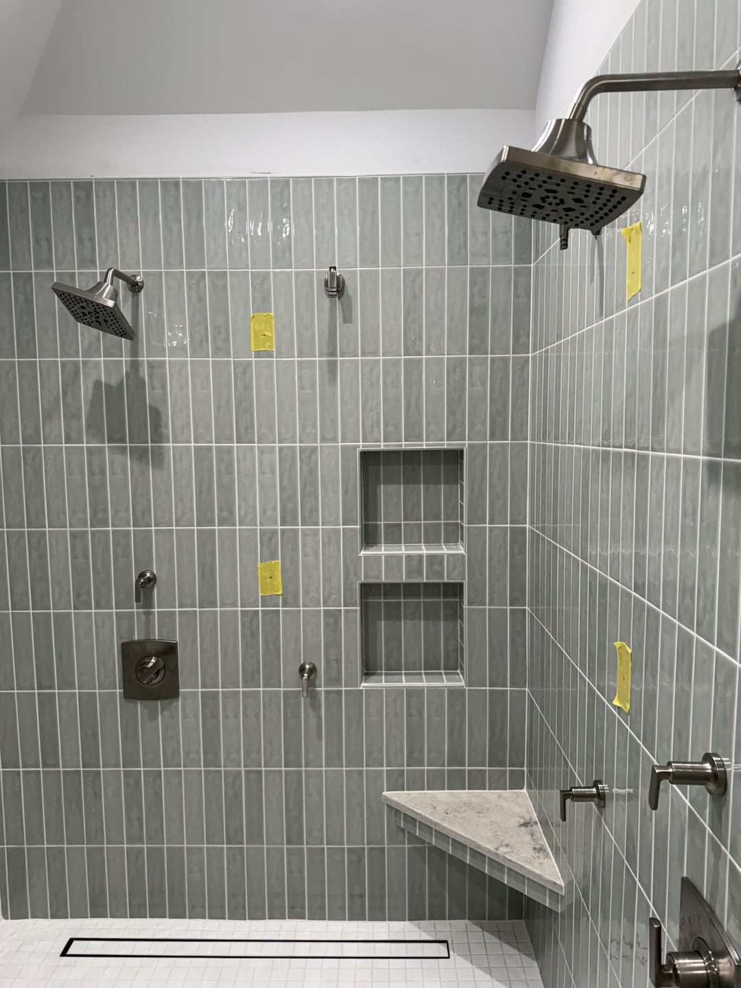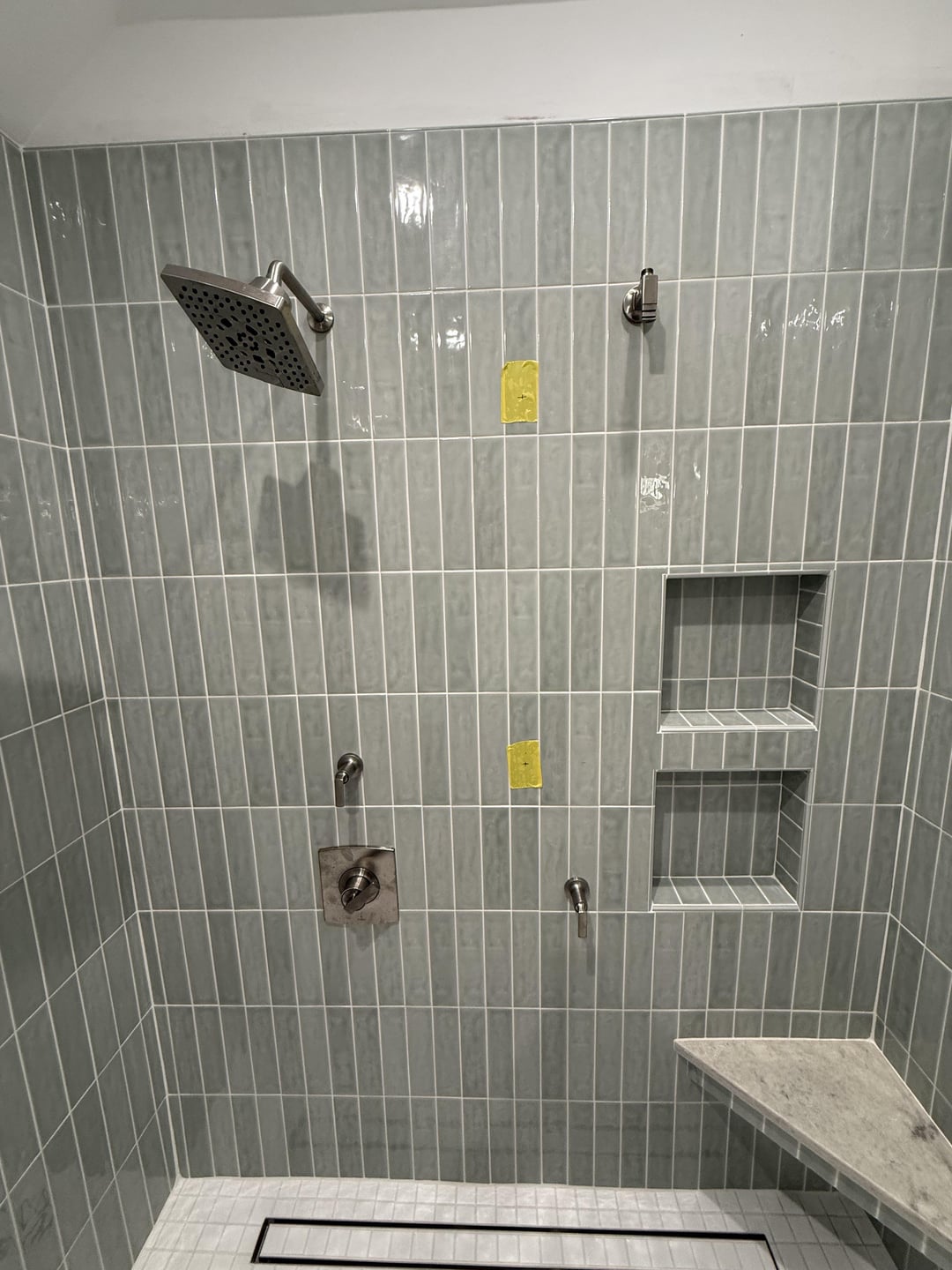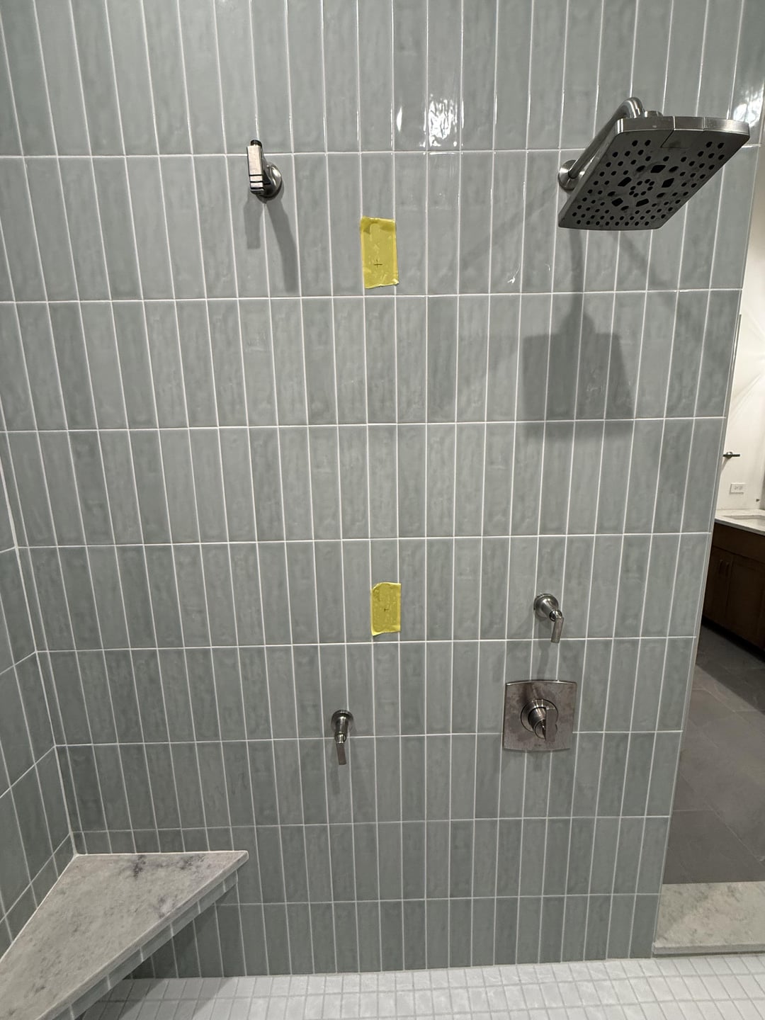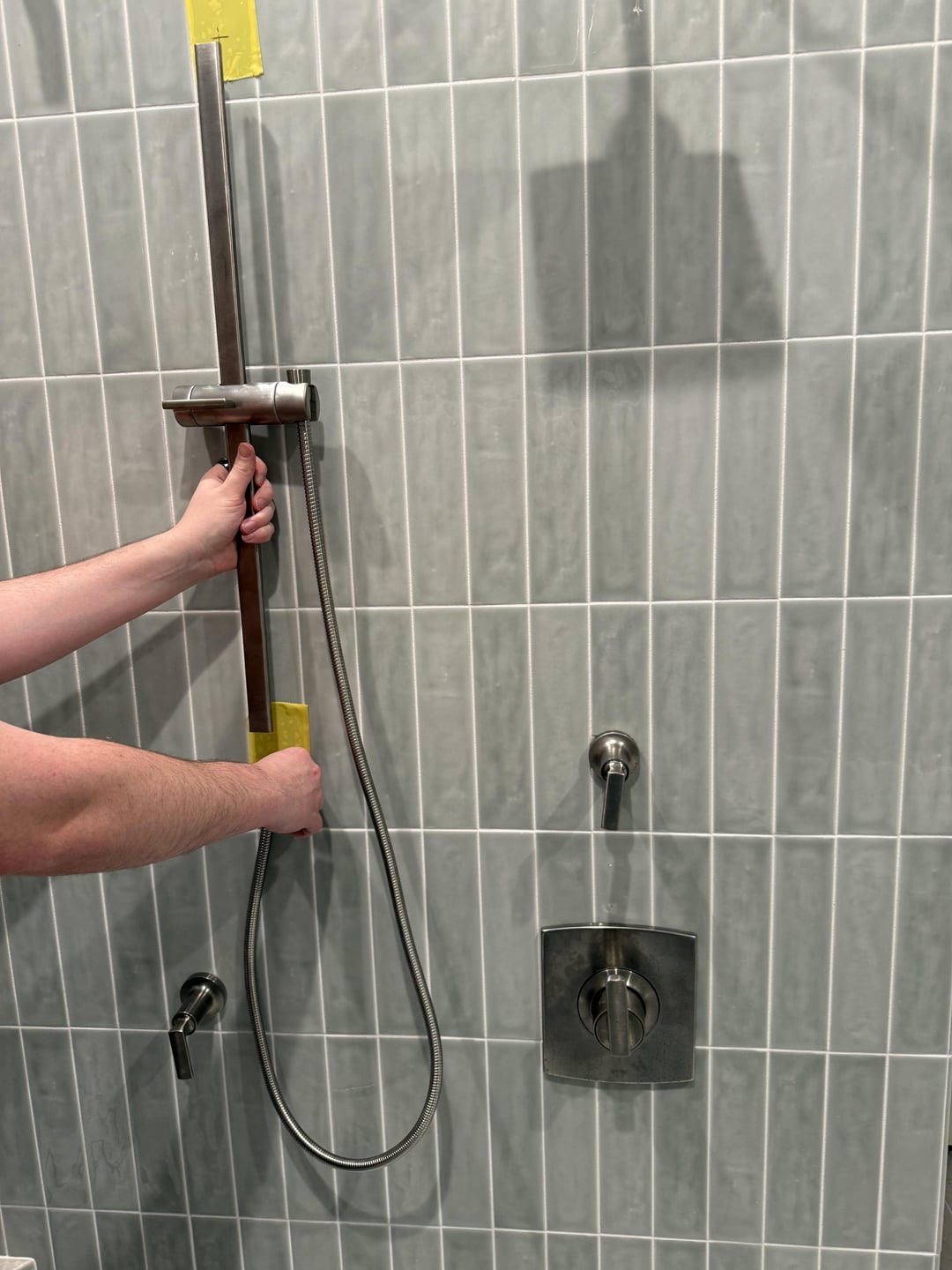 当社の配管工は、Brizo Kintsu 統合スライド バー ハンド シャワーの間違った場所に原石を置きました。具体的にどこに設置するか検討中です。当初考えていた場所に黄色のテープで印を付けましたが、約4インチ下げることを検討しています。どのようなご意見でも大歓迎です!