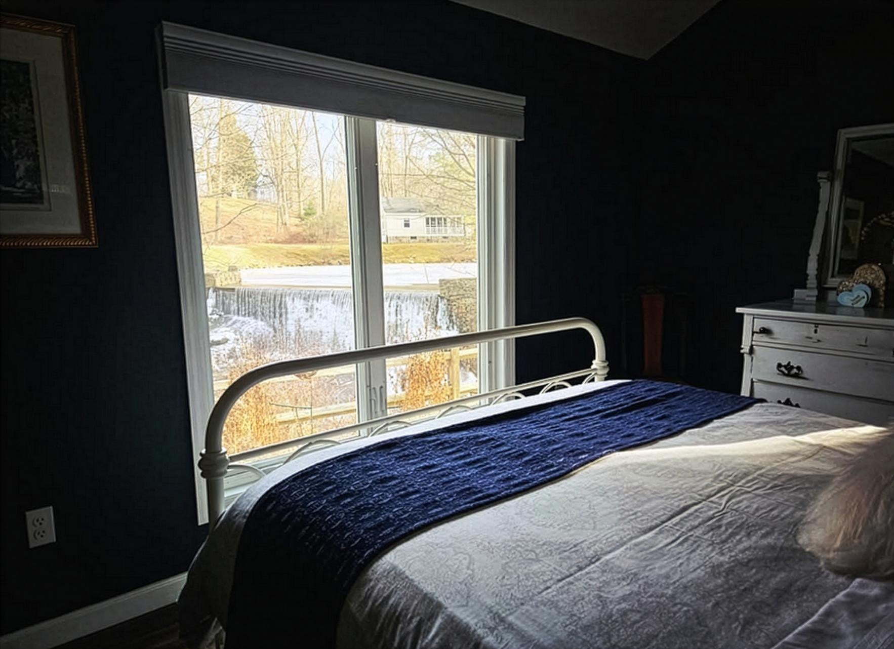 ニューヨーク州北部の裏庭の滝を寝室から眺める。