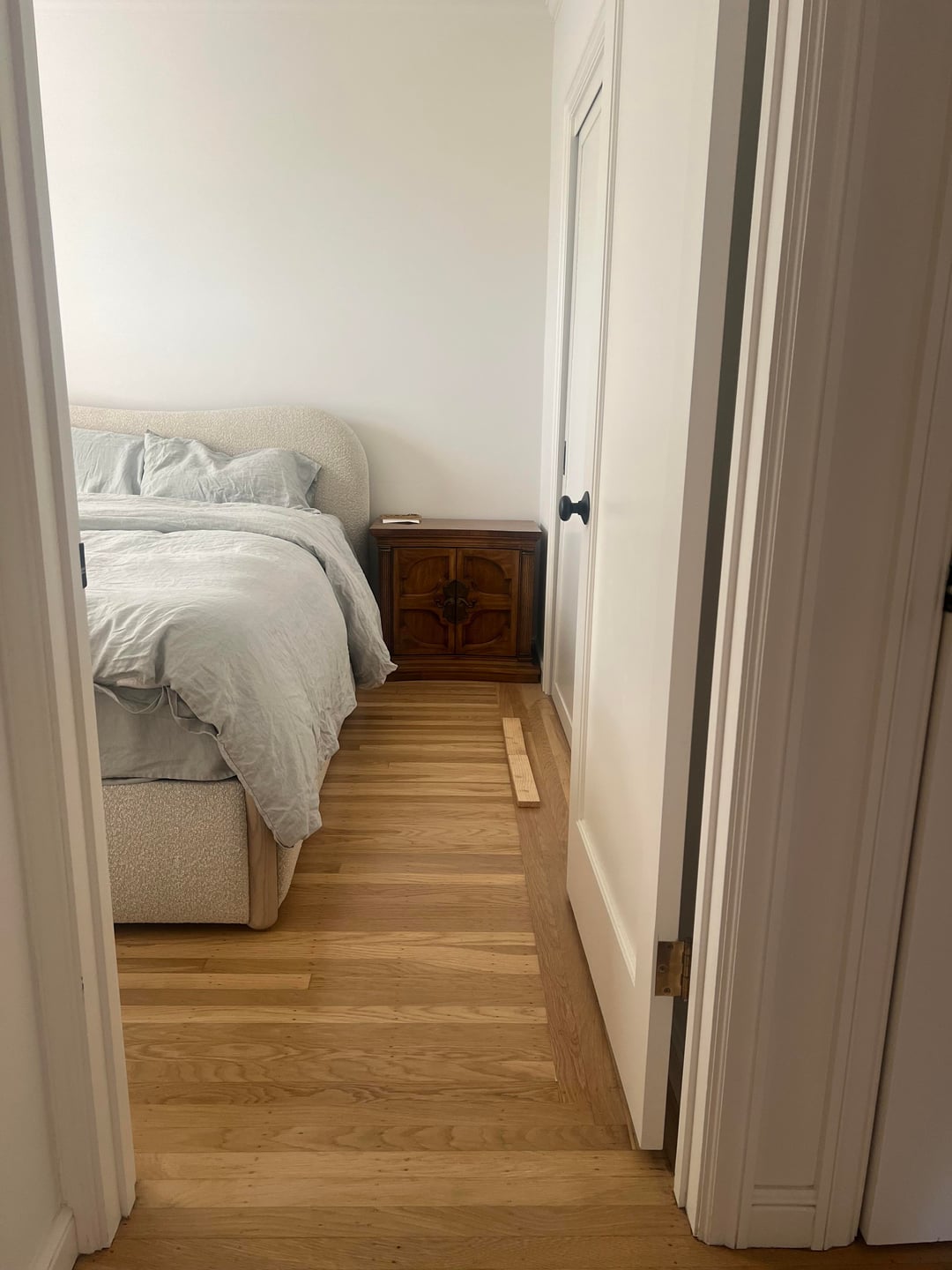 ラグはドレッサーから玄関ドアまで行くべきでしょうか、ドレッサーの途中で止めるべきでしょうか、それとも玄関ドアの途中で落としたほうがいいのでしょうか?左右に通気口(木材を置いた場所)のスペースを確保する必要があります。