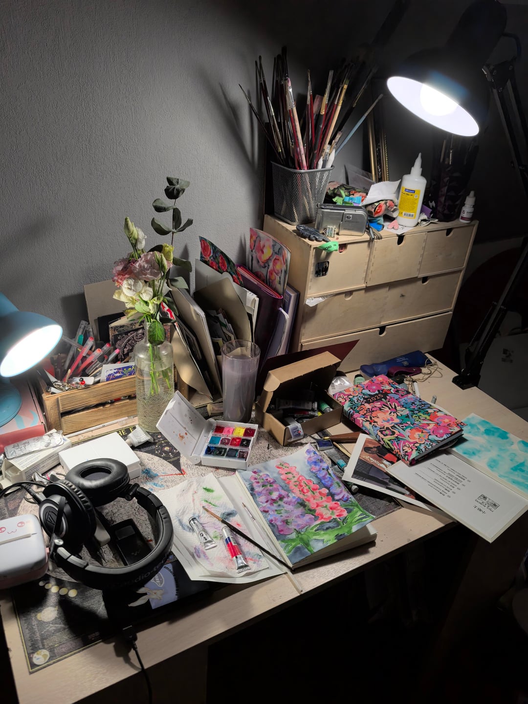 私のデスクはいつもカラフルでめちゃくちゃです 🎨✨