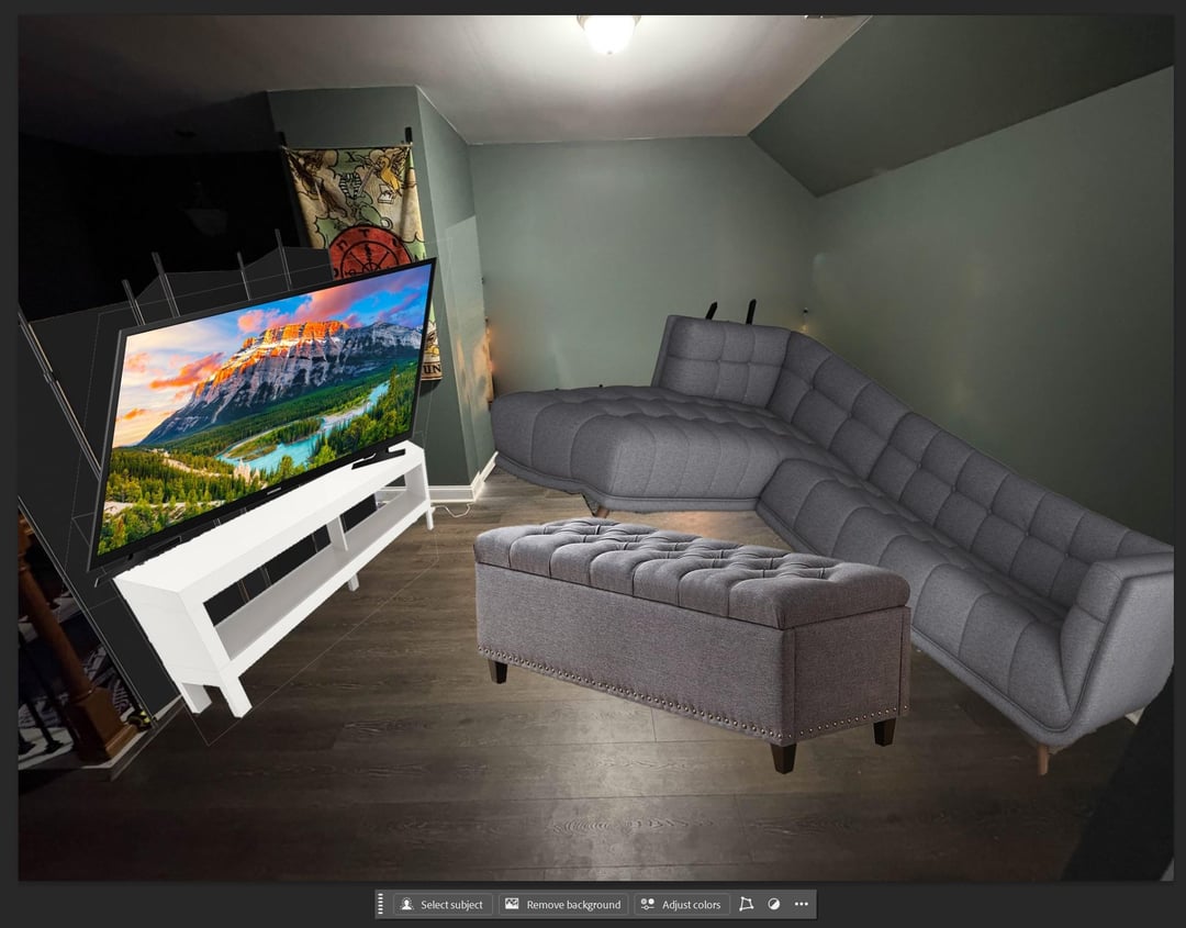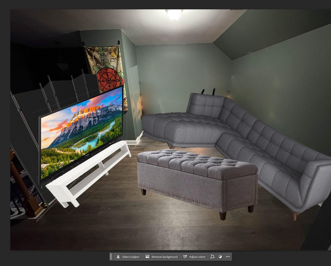 12フィート×12フィートのスペースで、コーナー部分は約2.5フィート×4フィートです。私が考えていることを昔ながらの方法で Photoshop でモックアップしました。