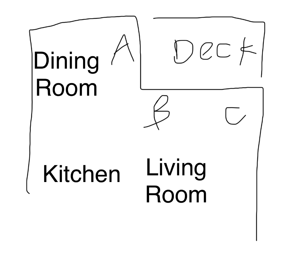 デッキを3シーズン用の部屋に改造することを検討しています。 A にはガラスのスライドドアがあり、B と C には窓があります。B と C の間には暖炉があり、その上にテレビがあります。誰かがこれまでにこのようなものを見たことがあるだろうかと思っています。リビングルームに 3 シーズンの部屋が見える窓があるのは奇妙に見えますか?コストの関係で、B と C の窓を開けて新しい部屋への入り口にすることはしたくありません。また、リビングルームに自然光がたくさん入ってくるので、B と C の窓を密閉するという考えも好きではありません。