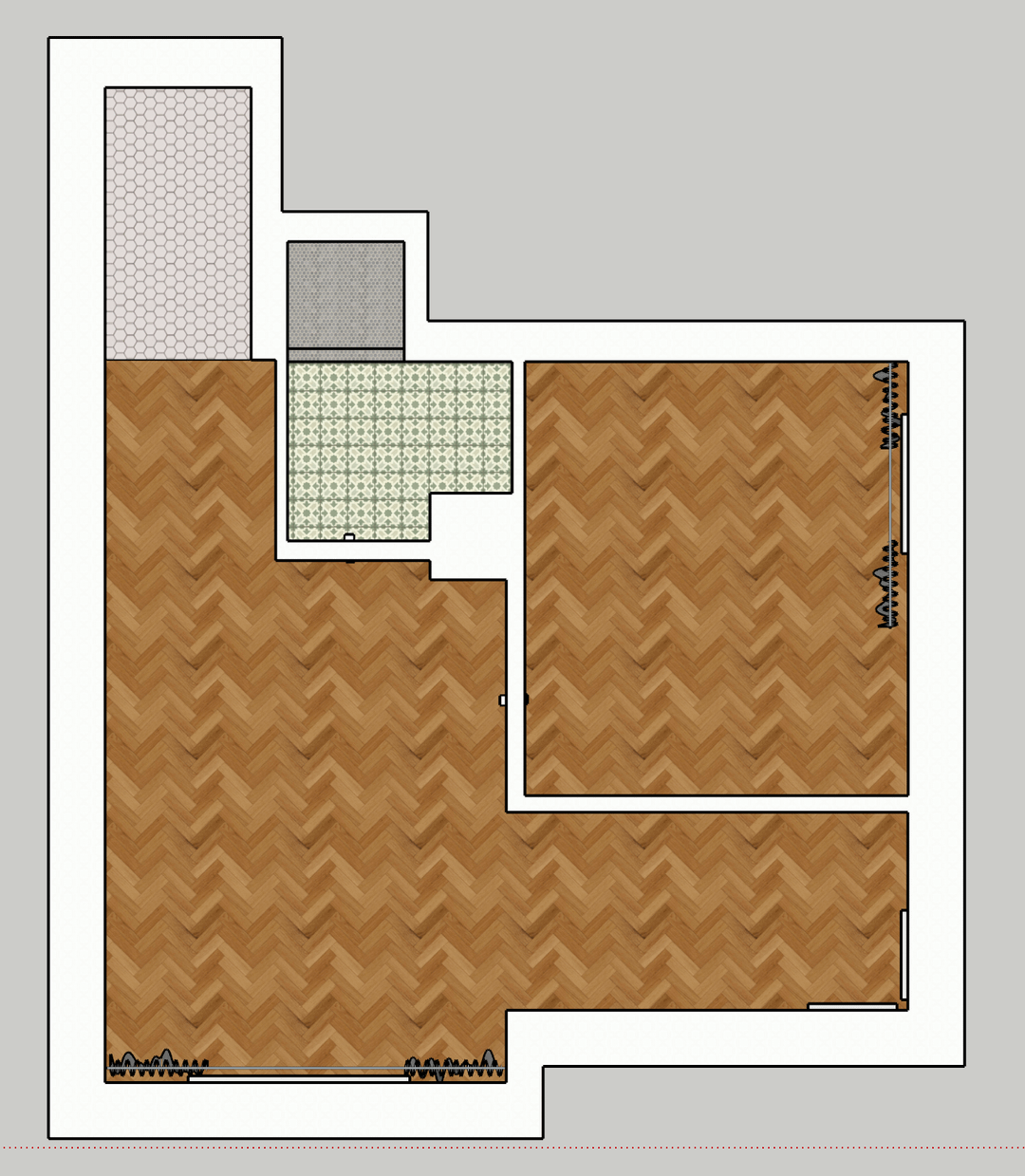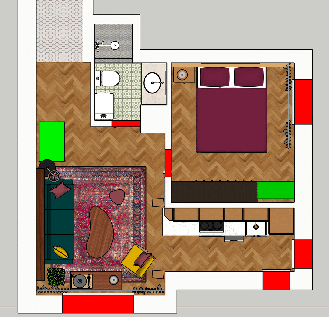 赤は窓とドアです。緑地は作業机を置くことができる場所です。