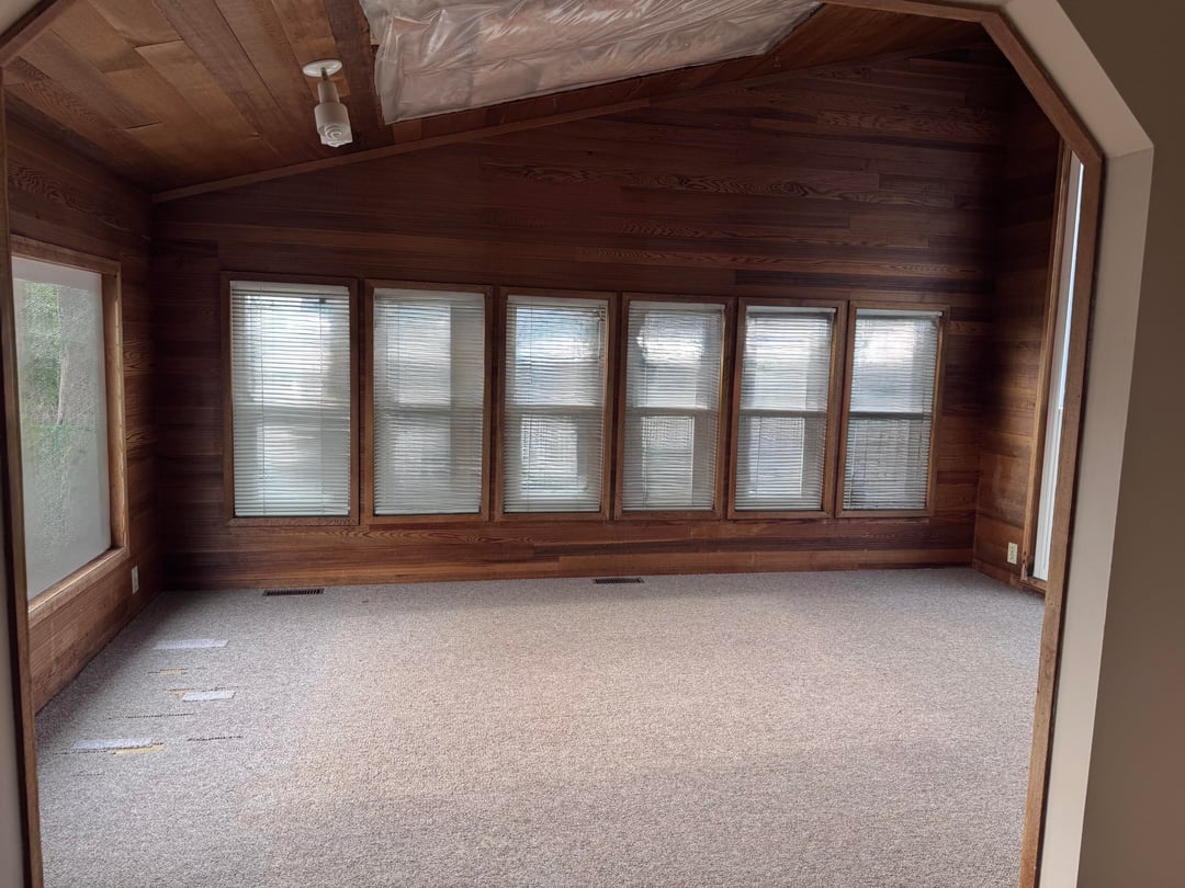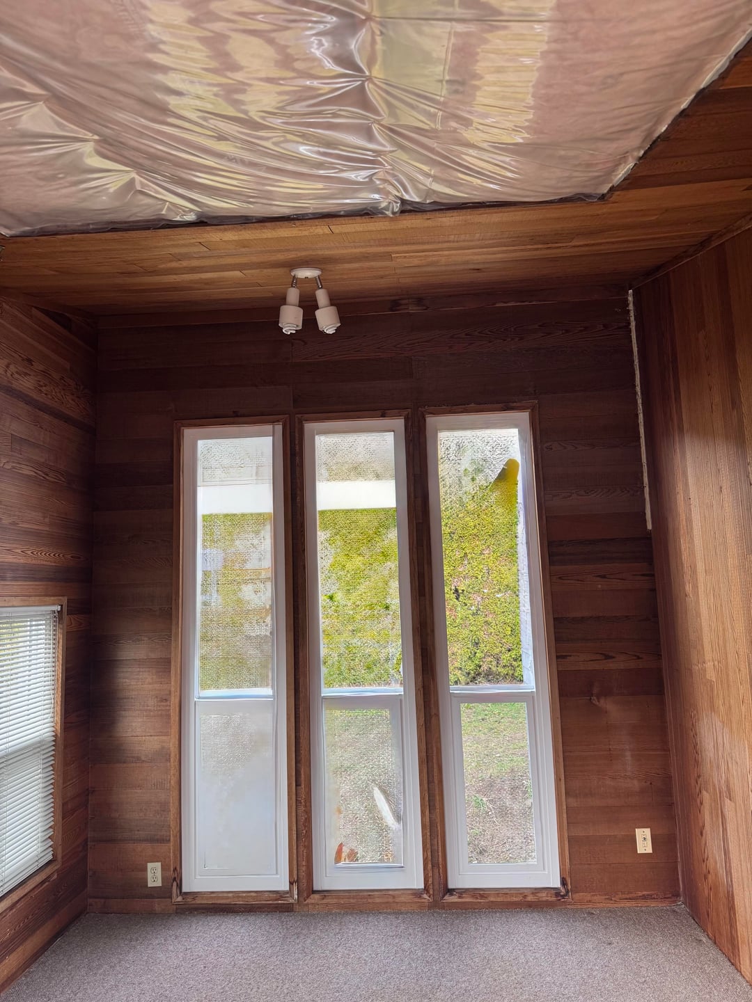 天井: パネルが取り外された天井の大部分があります。おそらく、ある時点で天窓が壊れたか、単に修理が必要だったのかもしれません。これを修復して部屋の他の部分と一致させるのは非常に難しいと考えているので(すべての壁と天井を再補修する必要がある)、天井だけを乾式壁に交換することを考えています。アクセントとして、またはそのためのアイデアとして、天井に木の一部を残すのはよさそうですか?それとも天井全体を乾式壁でやり直すだけですか (白くペイントしますか?) 照明器具についても何かアイデアはありますか?