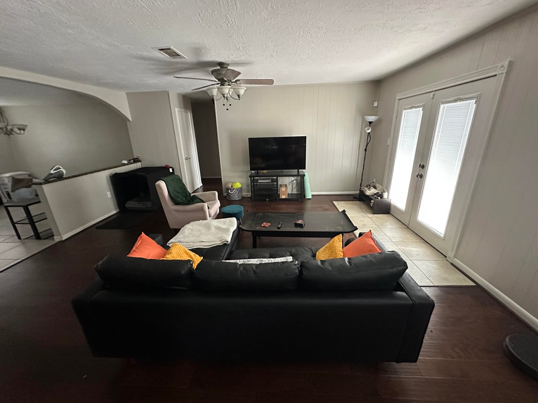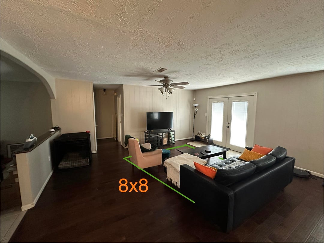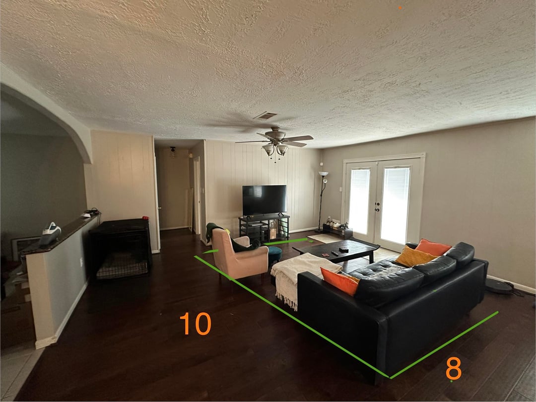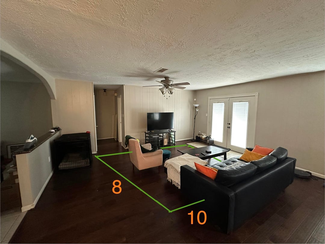 テレビの壁に廊下の開口部があり、パティオのドアの横にタイルがあるため、リビングルームのレイアウトが少しぎこちなくなっています。最適なラグのサイズを決めるのに困っています。私は当初、ラグが廊下の開口部と重なっていること、またラグの長辺(幅)がテレビと平行ではないことに懐疑的でしたが、提案は歓迎です。