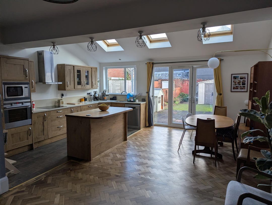 私たちは約1年前に引っ越してきましたが、この部屋の照明、特に黒いワイヤーフレームの「シェード」が付いた4つのライトの列に満足したことがありません。これらは、天井の下部、拡張時に追加された梁の下に固定されます。以前はダイニングテーブルがかなり暗かったので、壁に取り付けたランプをダイニングテーブルの上に吊るすように追加しました。満足しています。 4 つの列に同様のスタイルの球状ライトを検討しましたが、浮遊する球が多すぎる可能性があり、4 つの列でも奇妙に見える可能性があります。