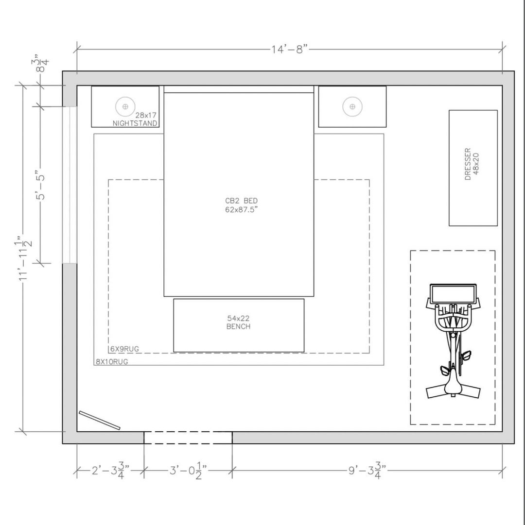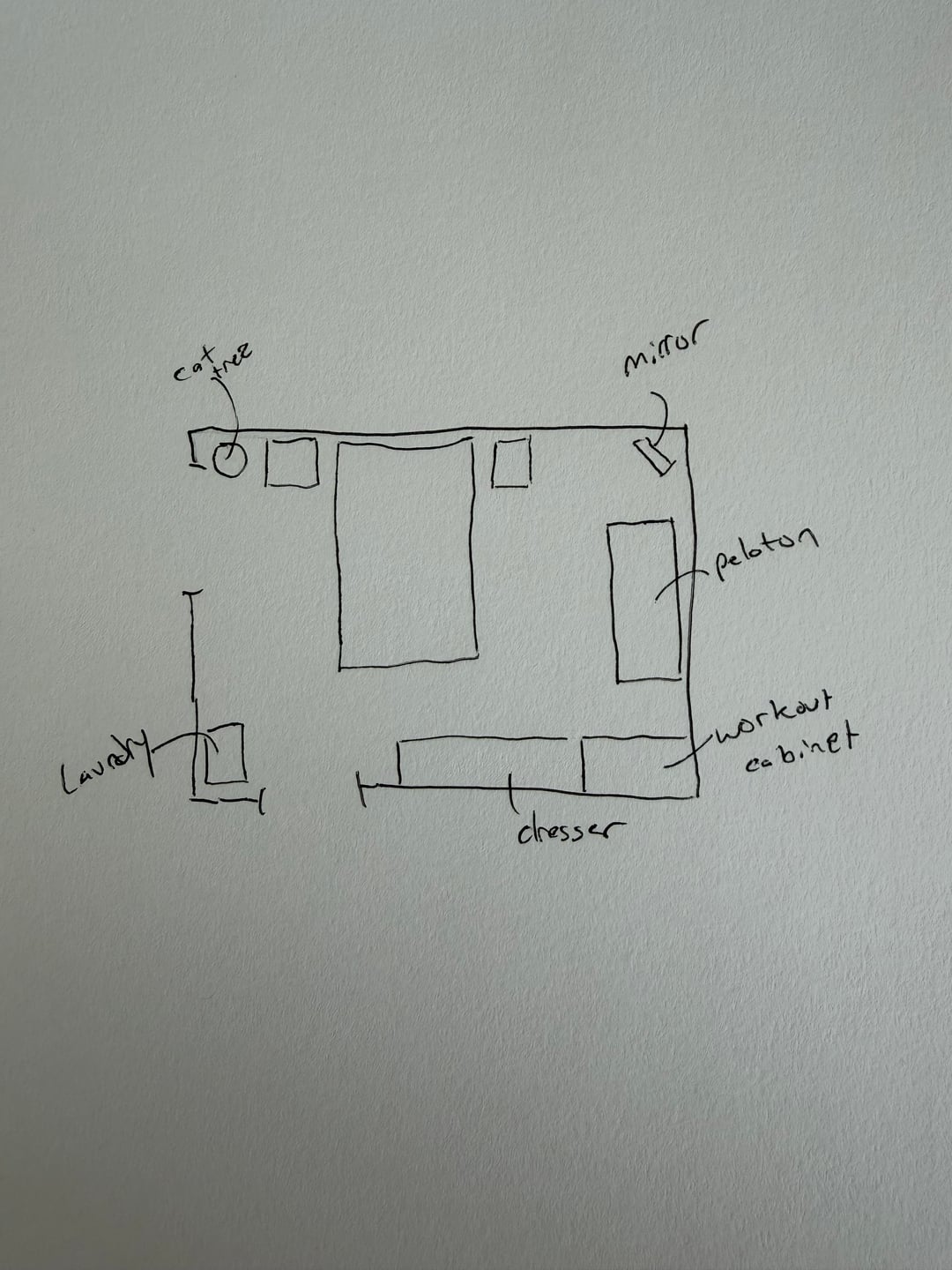 コンドミニアムの主寝室のレイアウトに問題があるので、アドバイスをいただければ幸いです。以前に考えた作業 (コンピューター化された画像) に基づいて、気に入ったレイアウト (手描き) にたどり着きました。スペースの制約と家具を考慮すると、同様の結論に達しますか、それとも部屋を別の方法でセットアップしますか?