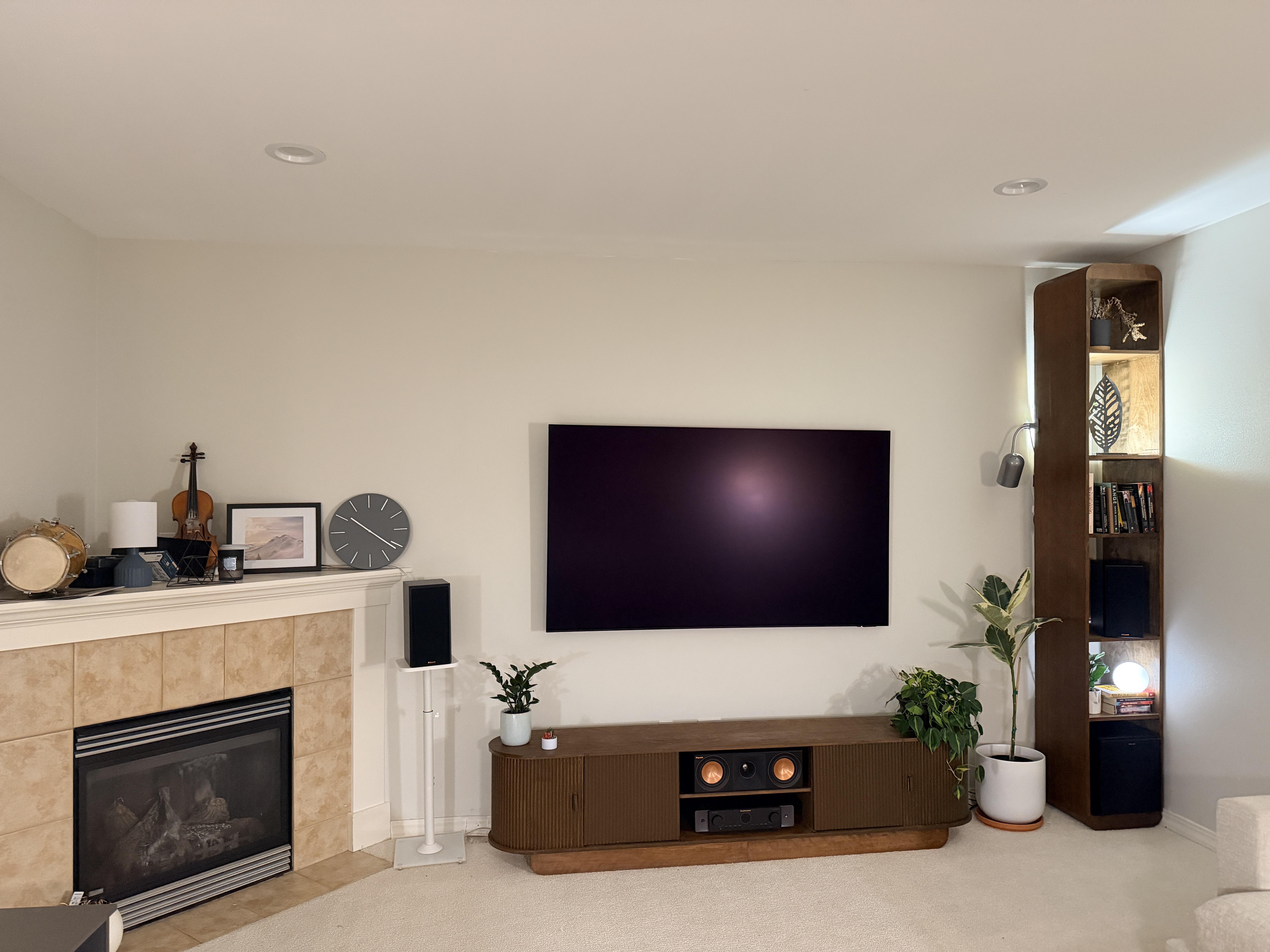 こちらはリビングルームのメディアウォールです。私は本棚を自分で作り、テレビ台を汚して、自分が望んでいた外観を作りました。