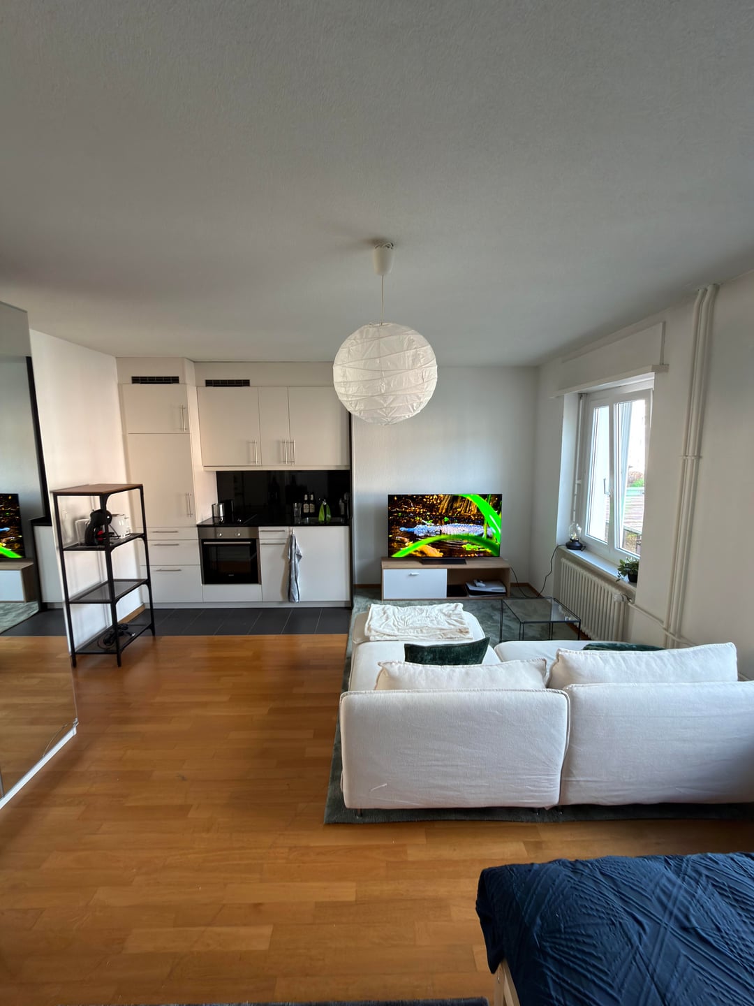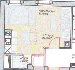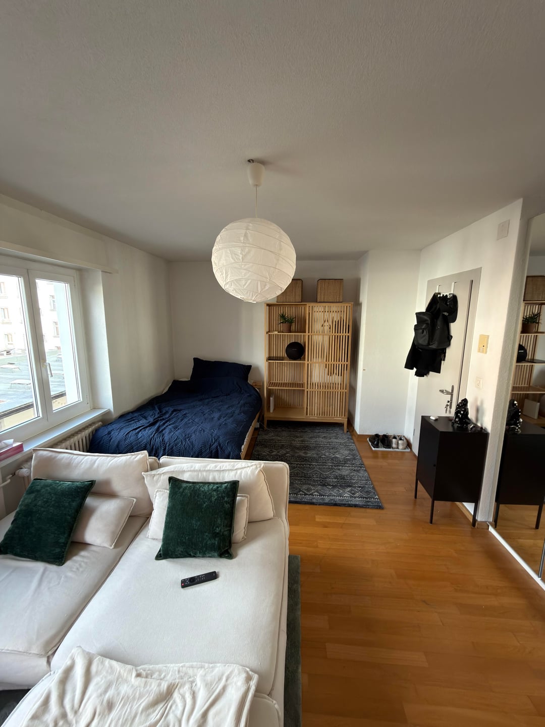 25㎡のワンルームアパートメントに、ベッド、ソファ、テレビ、収納、作業スペースを設置したいと考えています。私には現在「リビングルーム」がありますが、適切なダイニングエリアは手放さなければなりませんでした。モニターを 2 台置くためのデスクが必要なので、ベッドの横にあるワードローブを撤去してそこに置き、収納用の本棚を追加することを考えていました。ワードローブの幅は140cm(ベッドも含む)です。これをどのようにデザインしますか?ベッドを回転させて窓の前に小さめの机を置くとか?本棚や収納スペースも欲しいです。間取り図ではベッドはキッチンの隣にありますが、それはダメだと読みました。ご協力ありがとうございました!