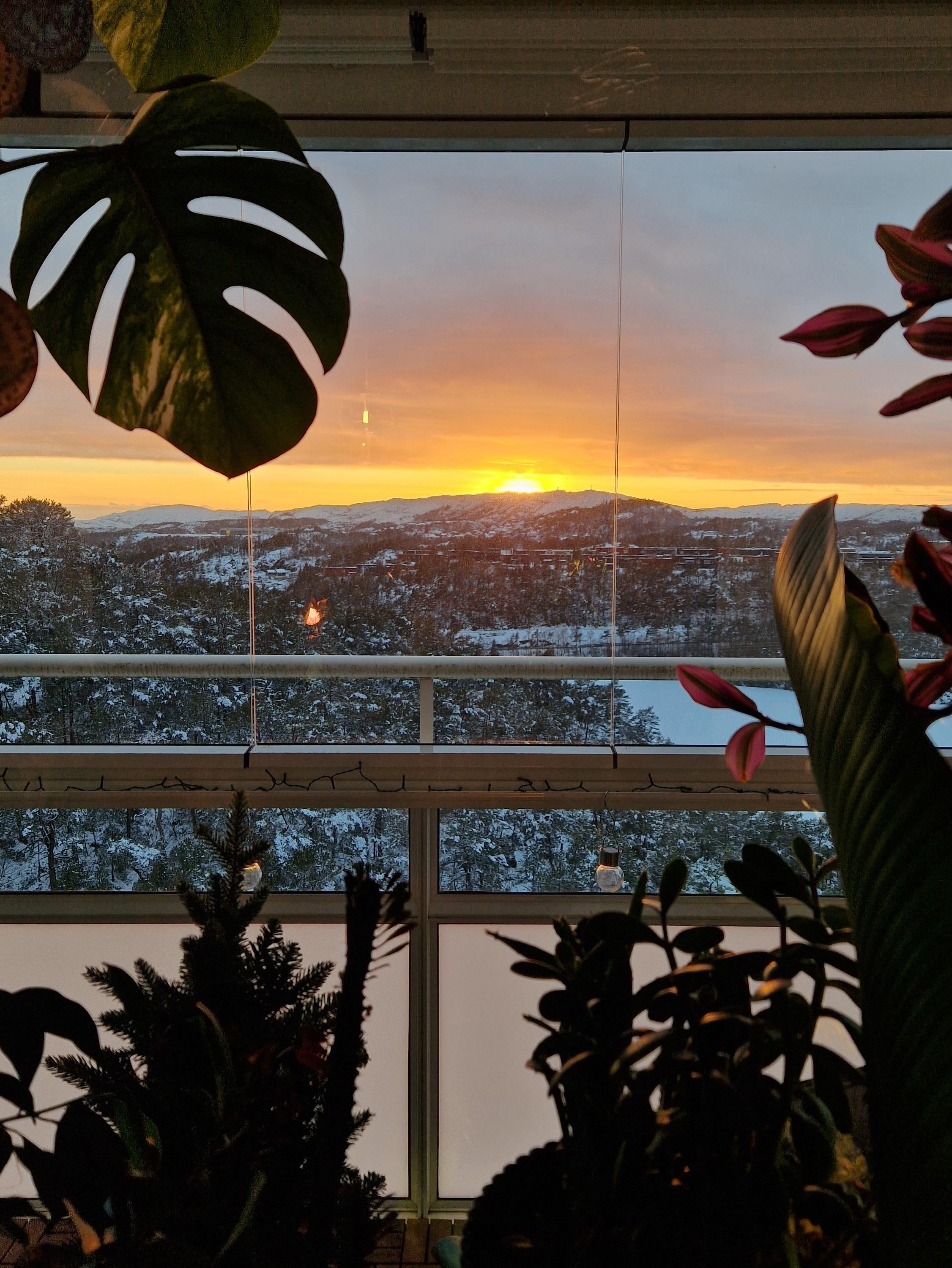 冬のバルコニーの夕日