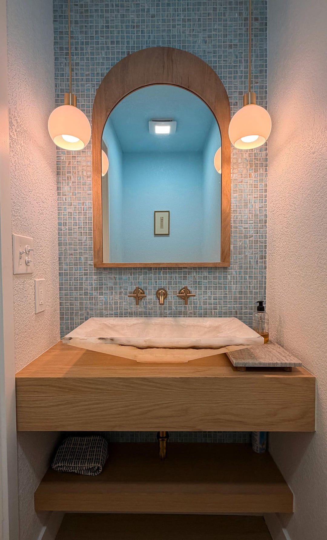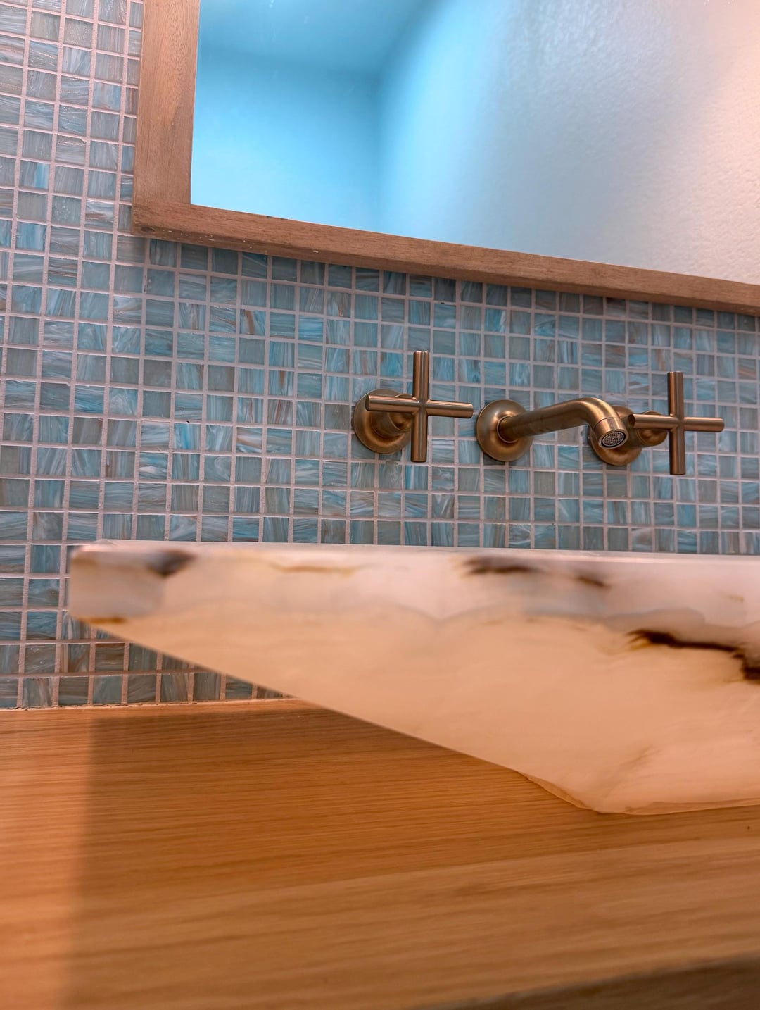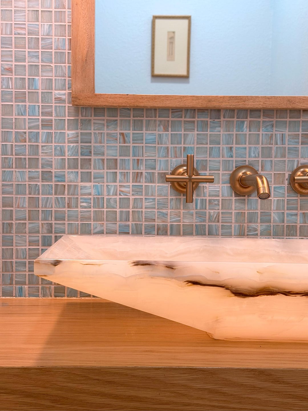 レイアウト、寸法、ハードウェア/材料など、すべてを自分で徹底的に設計し、請負業者にすべて設置してもらいました。小さな寸法(幅36インチ x 深さ16インチのカウンタートップ)にぴったりの完璧な石のシンクを見つけるために、文字通り何日も探しました。ついにこの完璧な長方形のホワイトオニキスをebayで200ドルで見つけました! (メガセールのとき、誰かがもっと静脈を期待していたと思います)。ガラスタイルとオンブレのグラデーションの壁は、永遠に穏やかでゴージャスです。