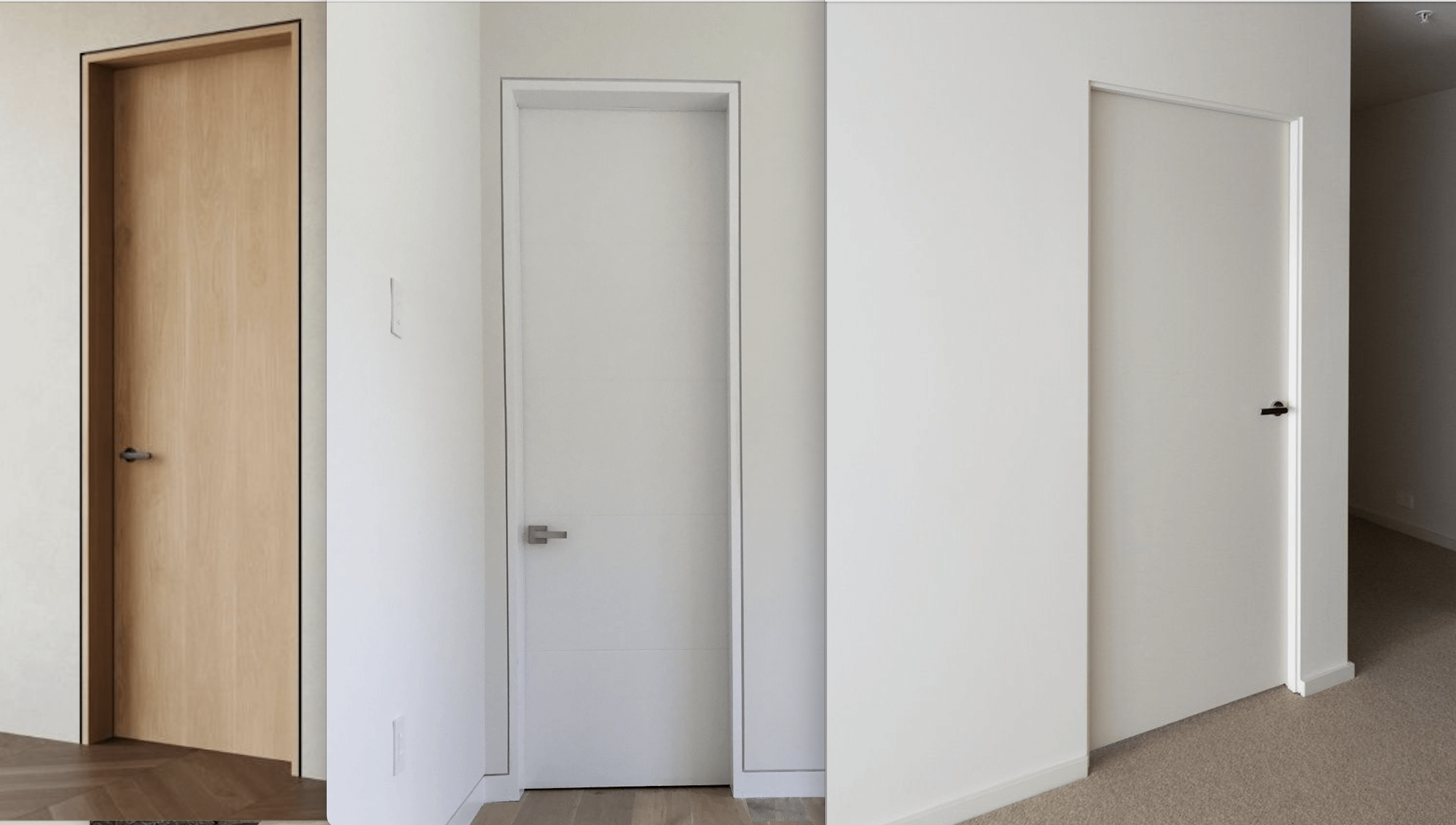 白いドアの問題: 白いドア枠に同じシャドウ ギャップを使用しても、同じ効果はありません。木材と乾式壁というマテリアルを分離するためにリビールを使用しなくなったためです。ここで、「同じ」マテリアルの区切りとして機能します。 **例は中央の写真です**。見た目は悪くありませんが、IMO としてはあまり良くありません。