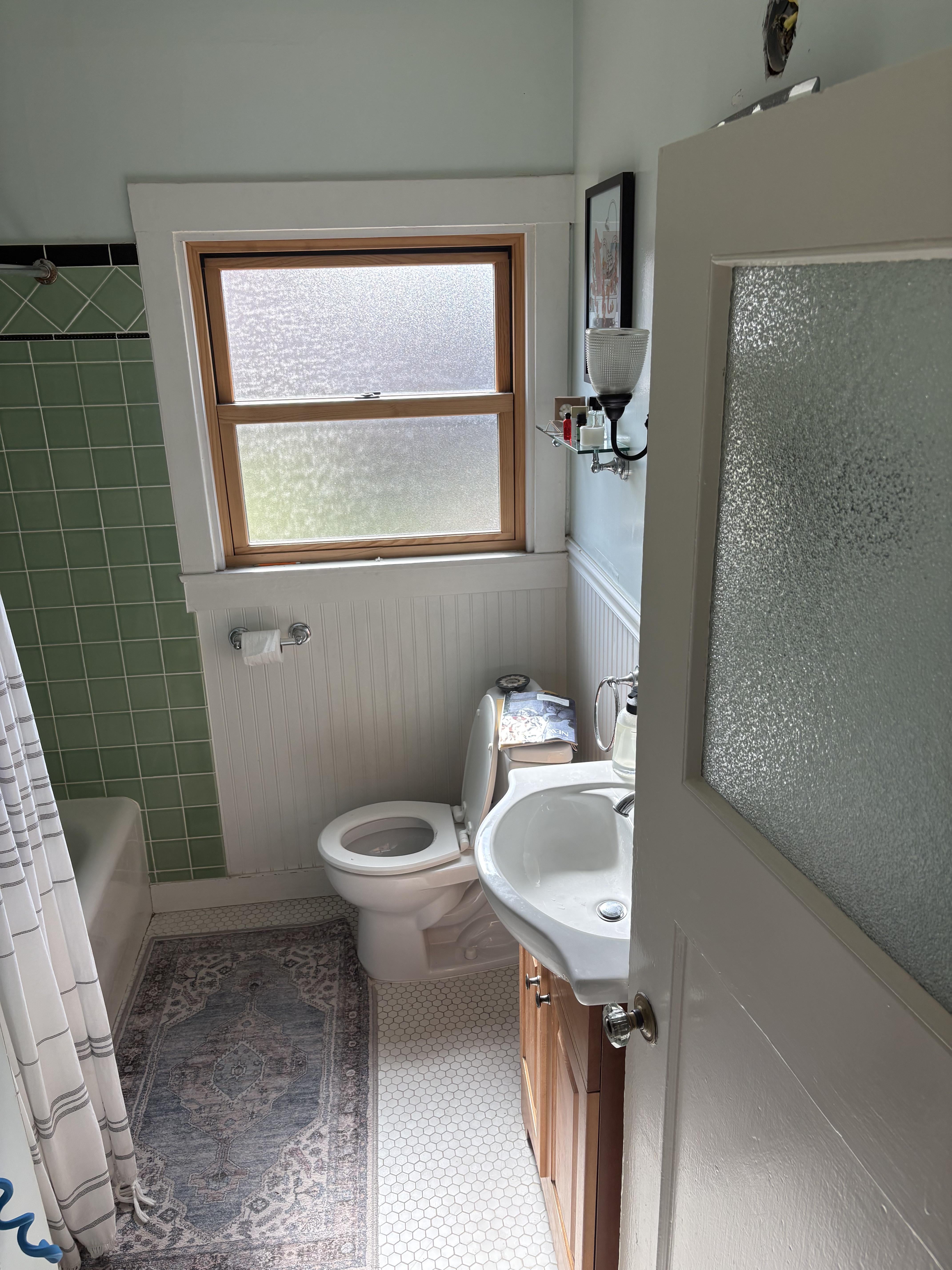 皆さん、こんにちは。これは小さなバスルーム(6×7フィート)です。バスルームは4人用に1つ。カウンタースペースがもっとあればいいのにと思います。バスルームもできるだけ広く感じたいです。 より広く感じるためにペデスタルシンクに切り替えますか?それともトイレを左側のクローゼット(見えません)に移動して、長くて大きな洗面化粧台を購入しますか? ありがとう