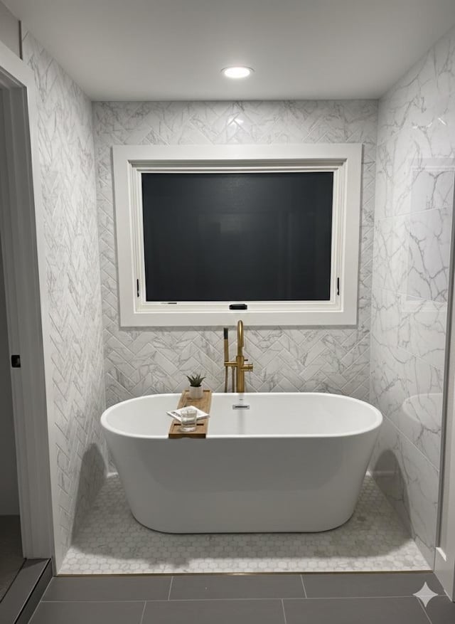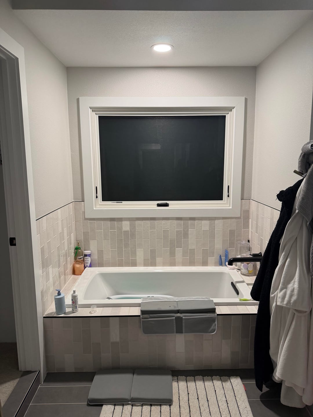 こんにちは。妻と私は現在の浴槽を撤去し、代わりに自立式浴槽を設置する予定です。私たちは完全に改装された直後に家を購入し、インテリアデザイナーの仕事のほとんどが気に入りましたが、マスターバスルームのタイルが好きではありません。コロラド州のタイル屋は異常に高価なので、今は床とシャワーのタイルをやり直すつもりはありません。