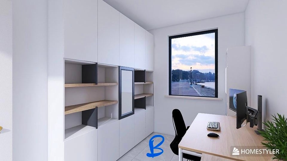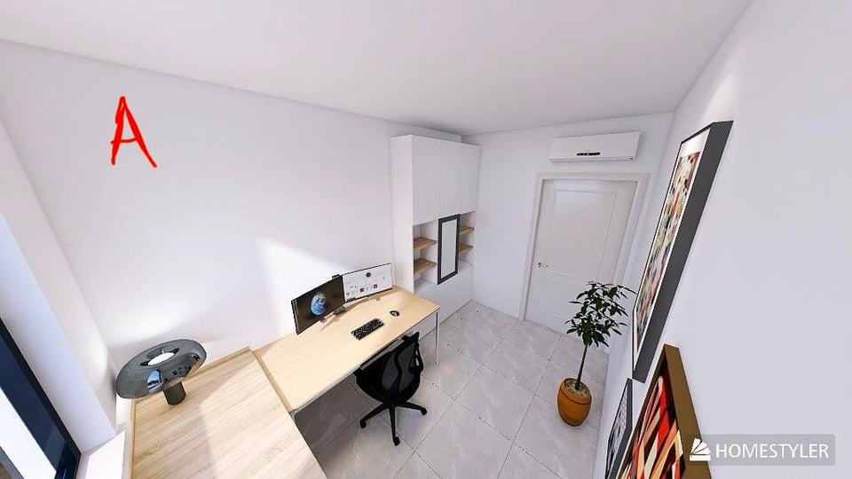 画像には私が考えた 3 つの選択肢 (A、B、C) がありますが、どれも私を完全に納得させます。私のスタジオをどのようにデザインしていただけますか?