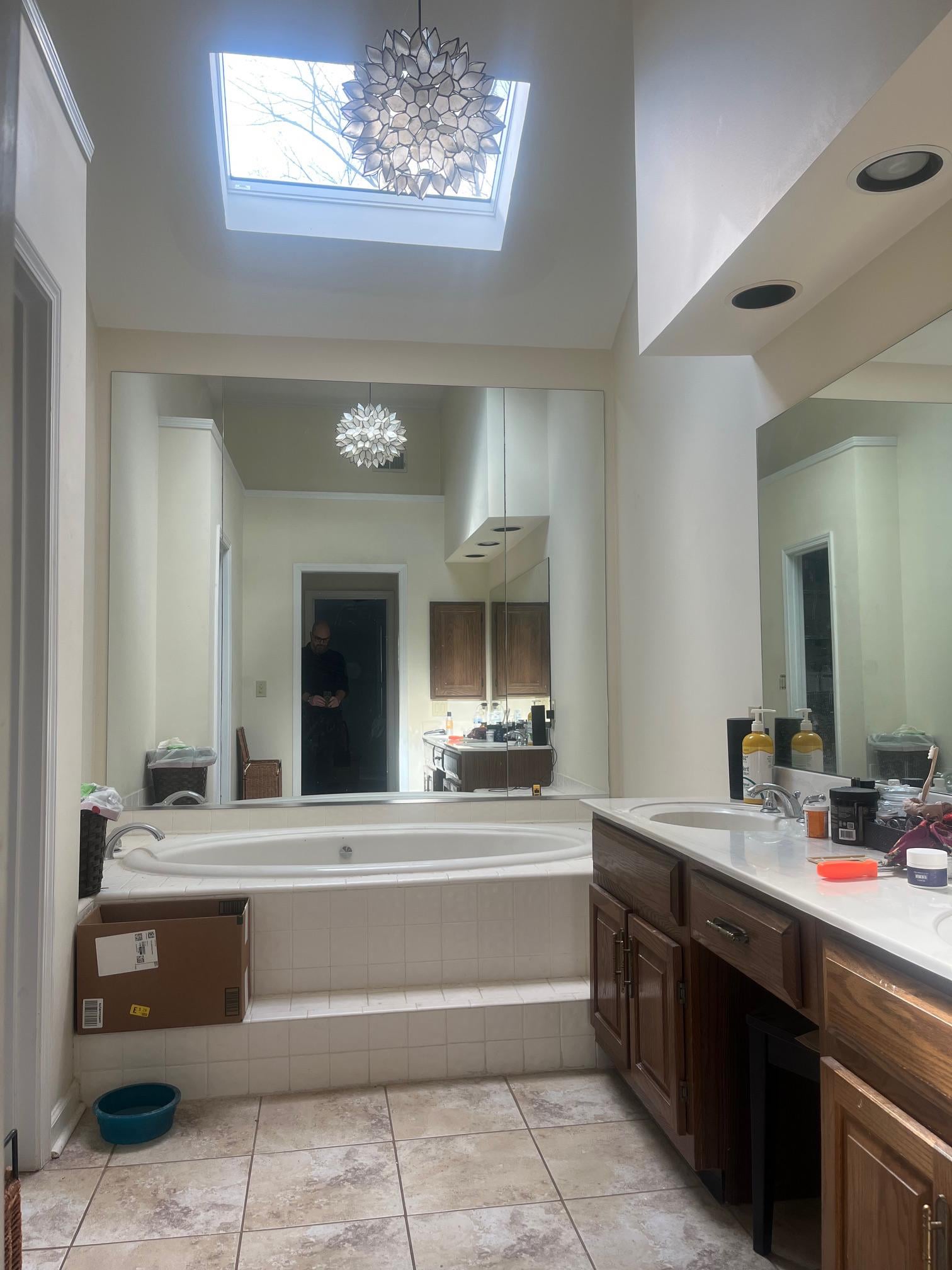 インテリアデザインって難しいですね。 このジャグジー浴槽をウォークインシャワーに改造する予定です。 シャワーヘッドの下にあるベンチについてどう思いますか?たくさんの写真を見ましたが、意見が欲しいです。 化粧台の隣にポニーの壁を作り、同じ壁にシャワーヘッドを付けることを考えています。