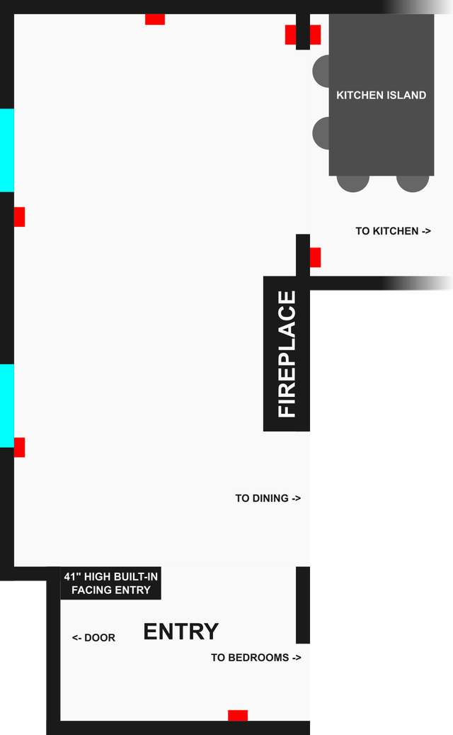テレビを暖炉のマントルの上に取り付けることも少し考えましたが、測ってみると、65 インチのテレビは少なくとも両側で 6 インチほど垂れ下がることになります。暖炉の南端の張り出しはダイニングルームへの入り口の障害となり、角を曲がってリビングルームに入るときにテレビにぶつかる可能性があります。さらに、電気接続(角を曲がったところからの延長コード以外)がないため、天井に新しいコンセントを設置する必要もありません。暖炉はむき出しのレンガ造りです。