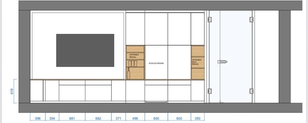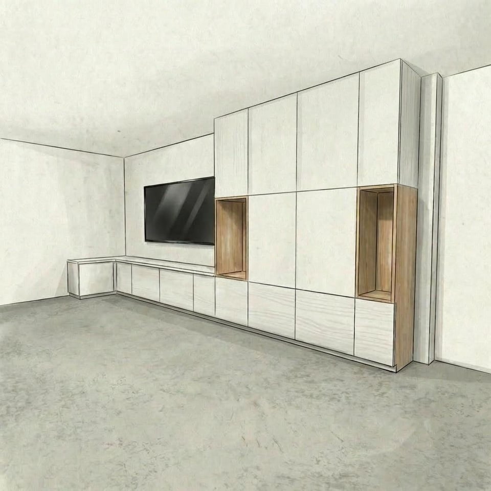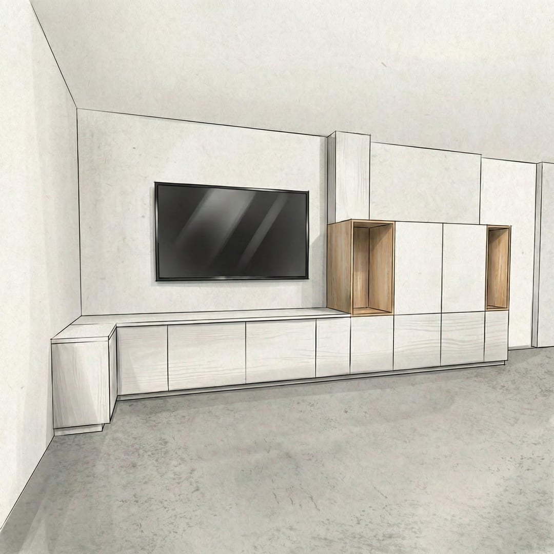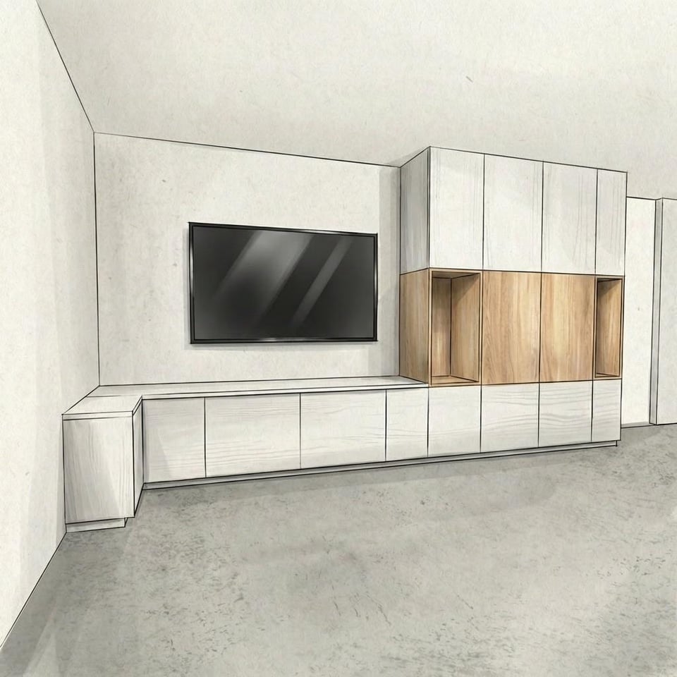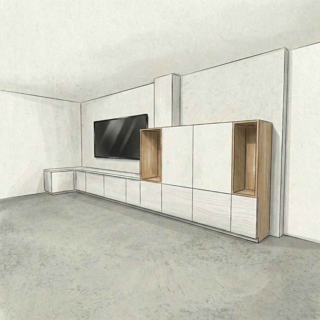 2つのアパートを組み合わせて、リビングルームを再設計しています。メディア ウォールには、テレビ、冷蔵庫、炭酸水システムが組み込まれている必要がありますが、中央には固定煙突があります。現在のデザインは大きく感じられ、部屋が狭くなります。よりスマートなレイアウトのアイデアを探しています。