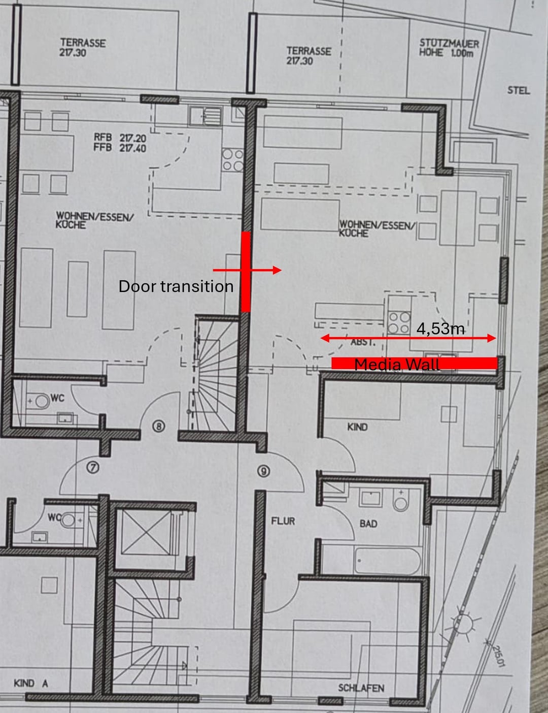 メディアウォールが設置されている壁はドアから窓までの合計が4.53メートルあります。平面図に記されています。
