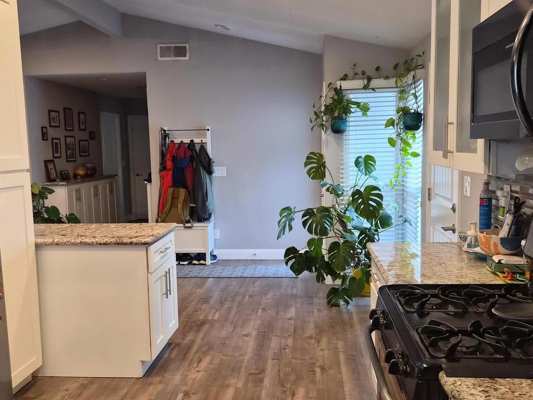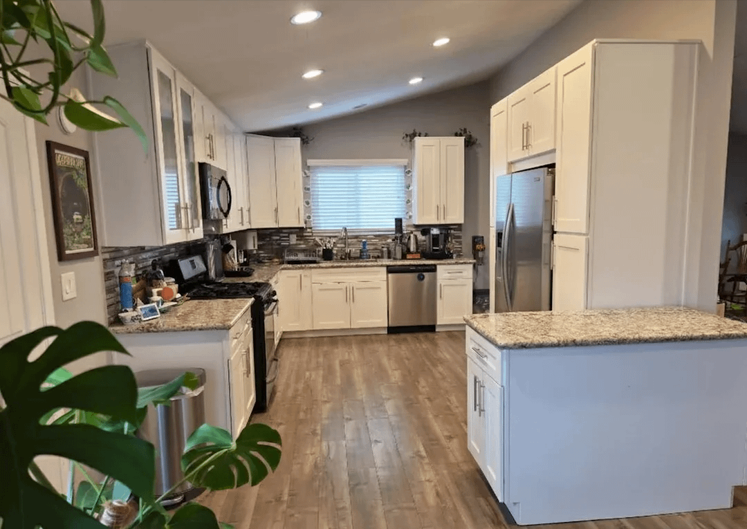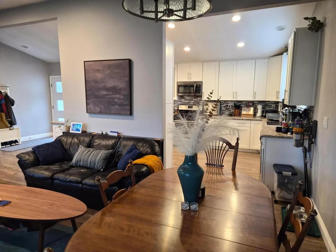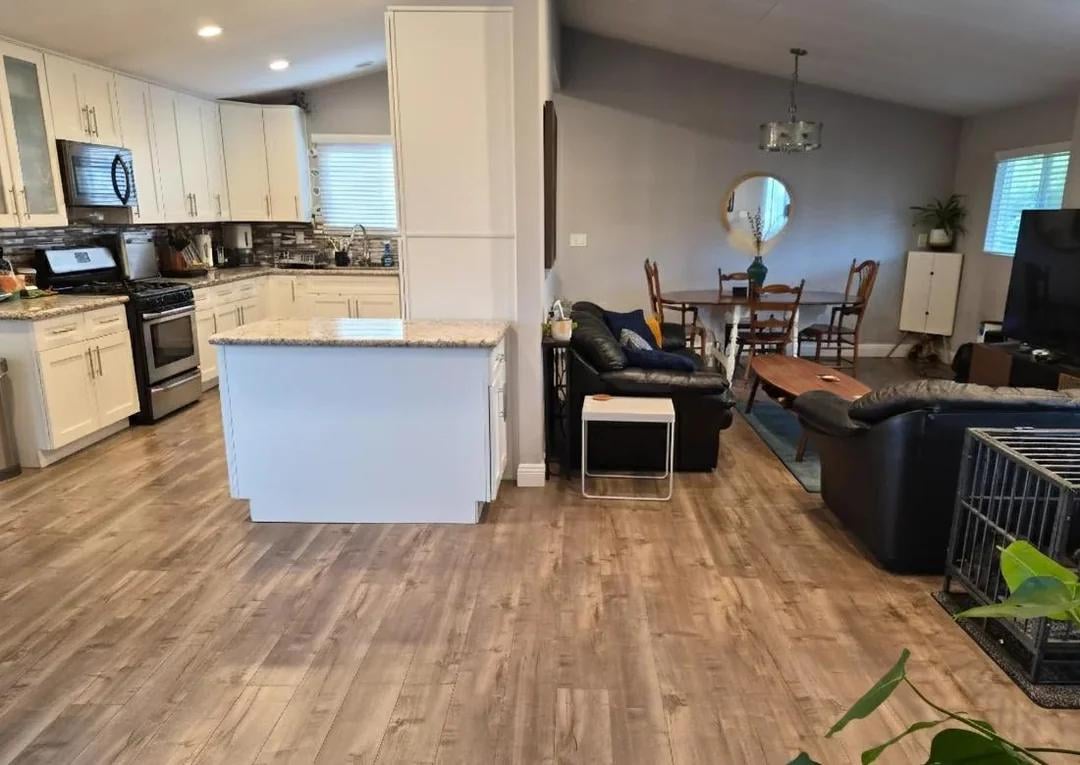 ダイニングエリアにはある程度のスペースを確保したいと考えていますが、現在のペンダントライトのあるエリアにダイニングエリアを置くことに執着していません。奇妙な小さな50" ×27" 冷蔵庫の横にあるキャビネットは可動アイランドになっていますが、キッチンに置くと動きが制限されすぎるので、その場所に住んでいます。でも、そのスペースを小さなキッチンテーブルに使えるかも?それとも、現在のダイニングエリアに埋め込み式のベンチシートを設置すれば、それを移動してリビングルームエリアにスペースを増やすことができるでしょうか?