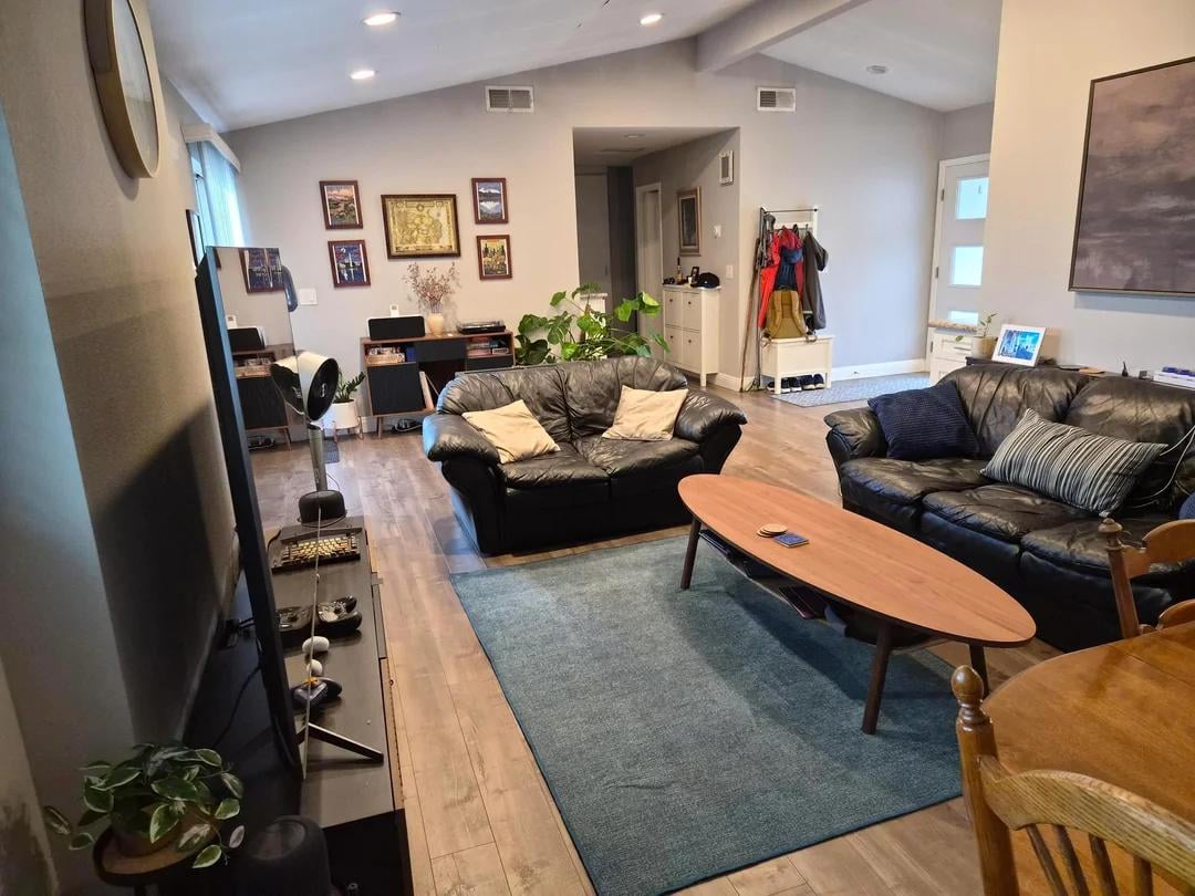 理想的にはソファを2つ置くのではなく、犬と一緒にみんなでソファに座れるL字型にしたいのですが、このレイアウトは厳しいですね!現在、テレビは大きなソファの向かい側にある、ぎこちなく出っ張った壁の上にあります(出っ張りは外部の暖炉用で、内部へのアクセスはありません)。 2つのソファを同じL字型に置き換えてもいいのですが、もっと効率的なレイアウトはないでしょうか?テレビを壁の一部に置く方が合理的でしょうか(テレビを反転させたり、大きなソファを設置したりするなど)。それとも、現在レコードプレーヤーやゲームが置かれている裏庭への引き戸のそばの壁にテレビを設置するのが良いでしょうか(リストの写真ではそのように設置されていました)。
