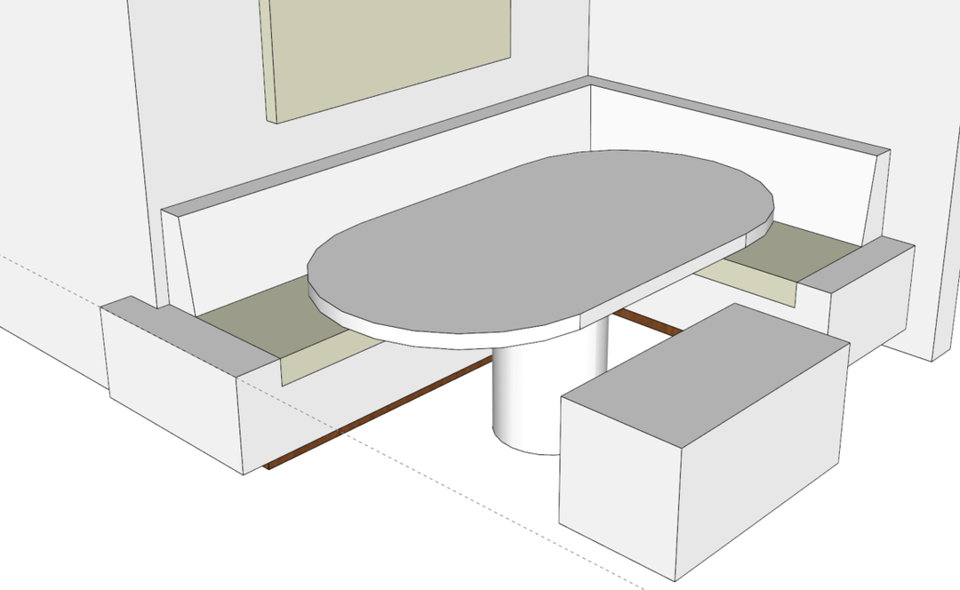 背もたれの角度は10度です。これはすべて非常に標準的だと思いますが、誰かが何かアイデアを持っているかどうかを確認したいと思いました。私は今のところジオメトリに夢中ではありませんが、構築するとうまく見えると思います。鋭い角を避けるために丸薬の形をしたテーブルを考えています。箱はベンチか椅子 2 脚を置くためのプレースホルダーです。背もたれに枕を置くことだけを考えていますが、そのために座面の奥行きをさらに増やす必要はないと思います(?)。