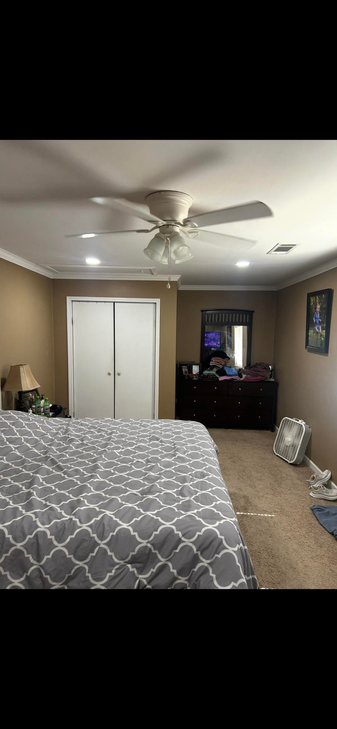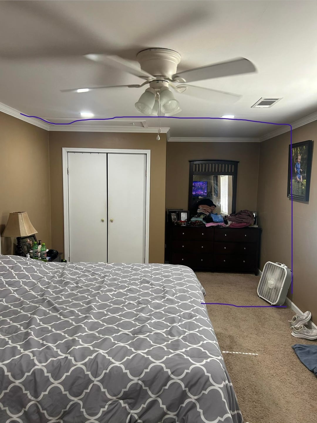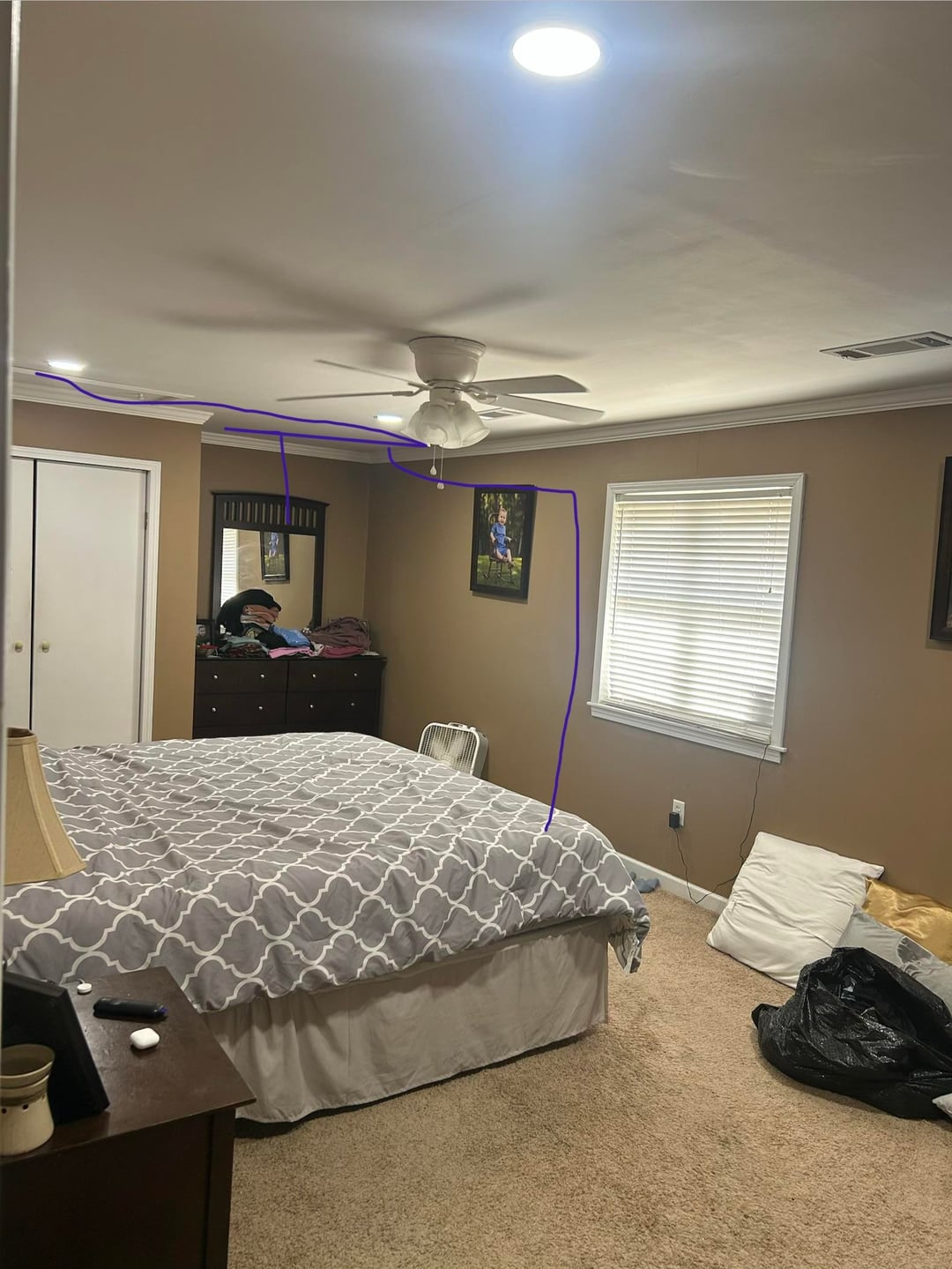 こんにちは。計画的に寝室の改修とのバランスをとるのに助けが必要です。壁を作って大きなウォーキングクローゼットを作る予定です。ご覧のとおり、クローゼットのスペースが非常に不足しています。私たちの寝室は長いので、寝室を広くしても、素敵なクローゼットのために平方フィートをあきらめることができます。質問なのですが、部屋のバランスはどうですか?新しい壁では、窓と天井ファンが中心からずれてしまいます。これで大丈夫でしょうか?何かお勧めはありますか?ここに、壁が写真に含まれる場所の非常に大まかな線があります。写真はドアの入り口から撮影されているため、壁はすぐ右側にあります。ご協力をよろしくお願いいたします。