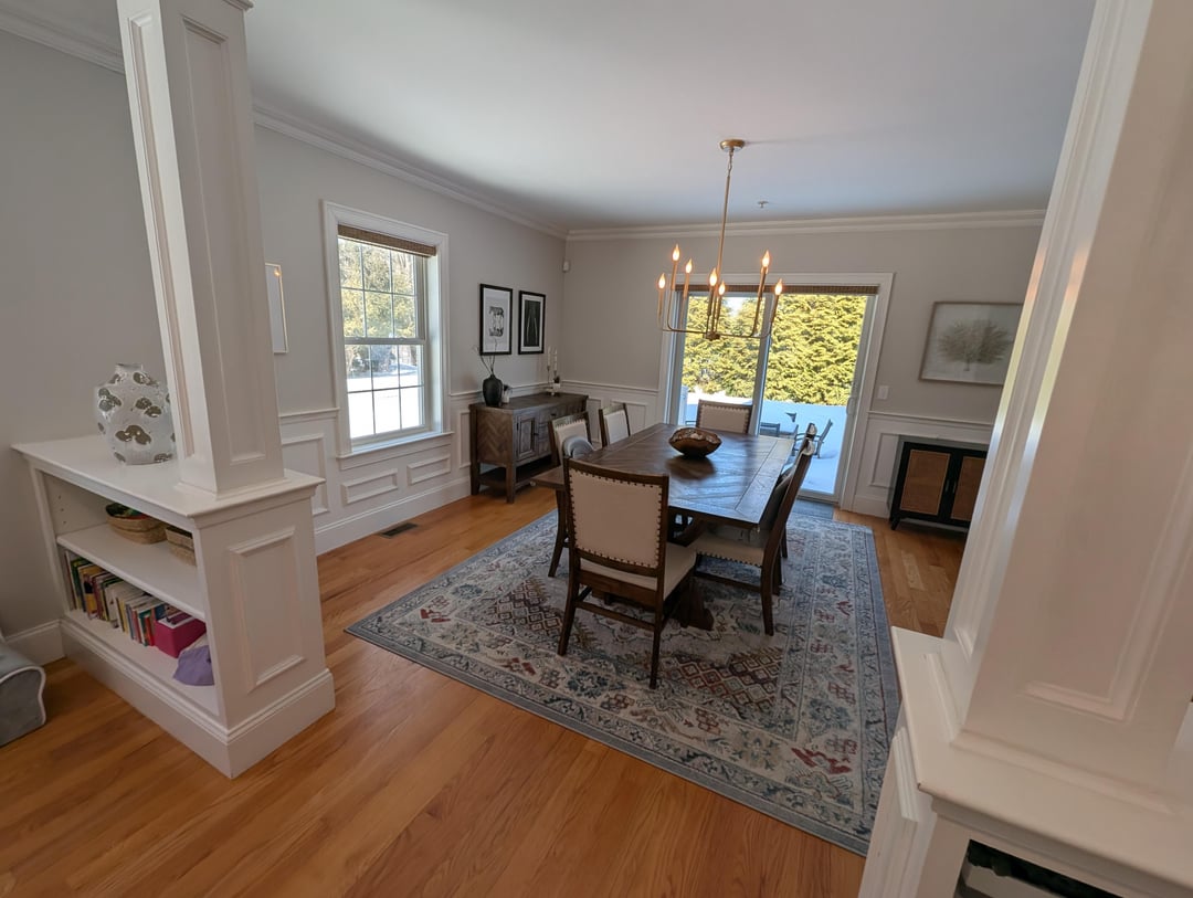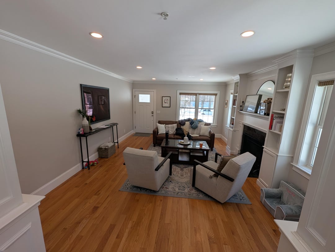 これは、現在の住宅所有者が、完成した地下室にテレビルームを備えた、よりフォーマルなリビングルームとして設置した方法です。テレビとゲスト用の椅子を設置しつつ、混雑しすぎないようにする方法を模索中です。部屋の寸法は 13 フィート x 19 フィート弱です。参考までに 2 枚目の写真、反対側にダイニング ルームがあります。それは玄関ドアですが、主にガレージとは別のドアを使用します。