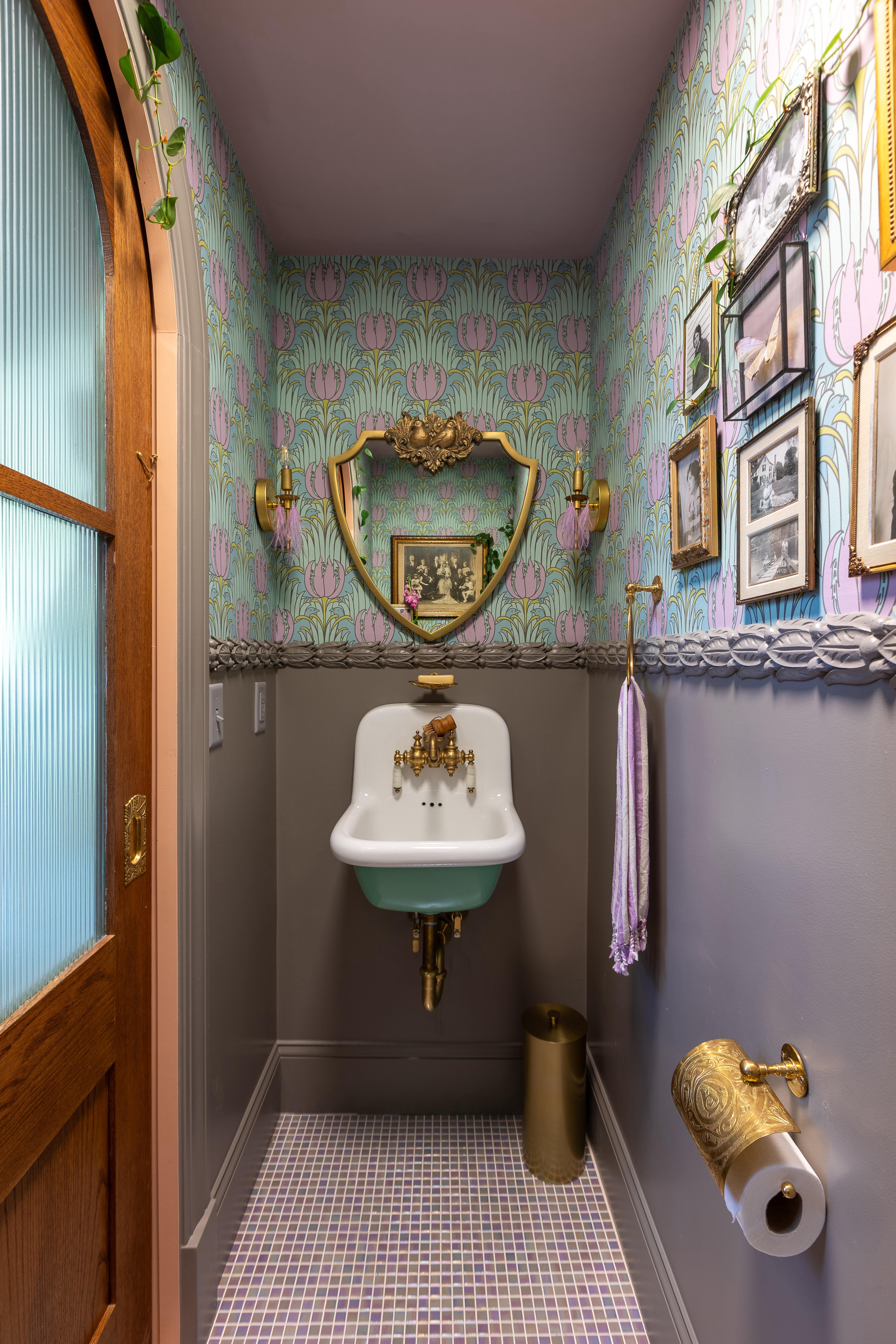 天井のサン トンネル (写真には写っていません) から、この「内陸」のパウダー ルームに自然光が差し込みます。1895 年頃の CFA Voysey によるチューリップと鳥の壁紙が特徴です。