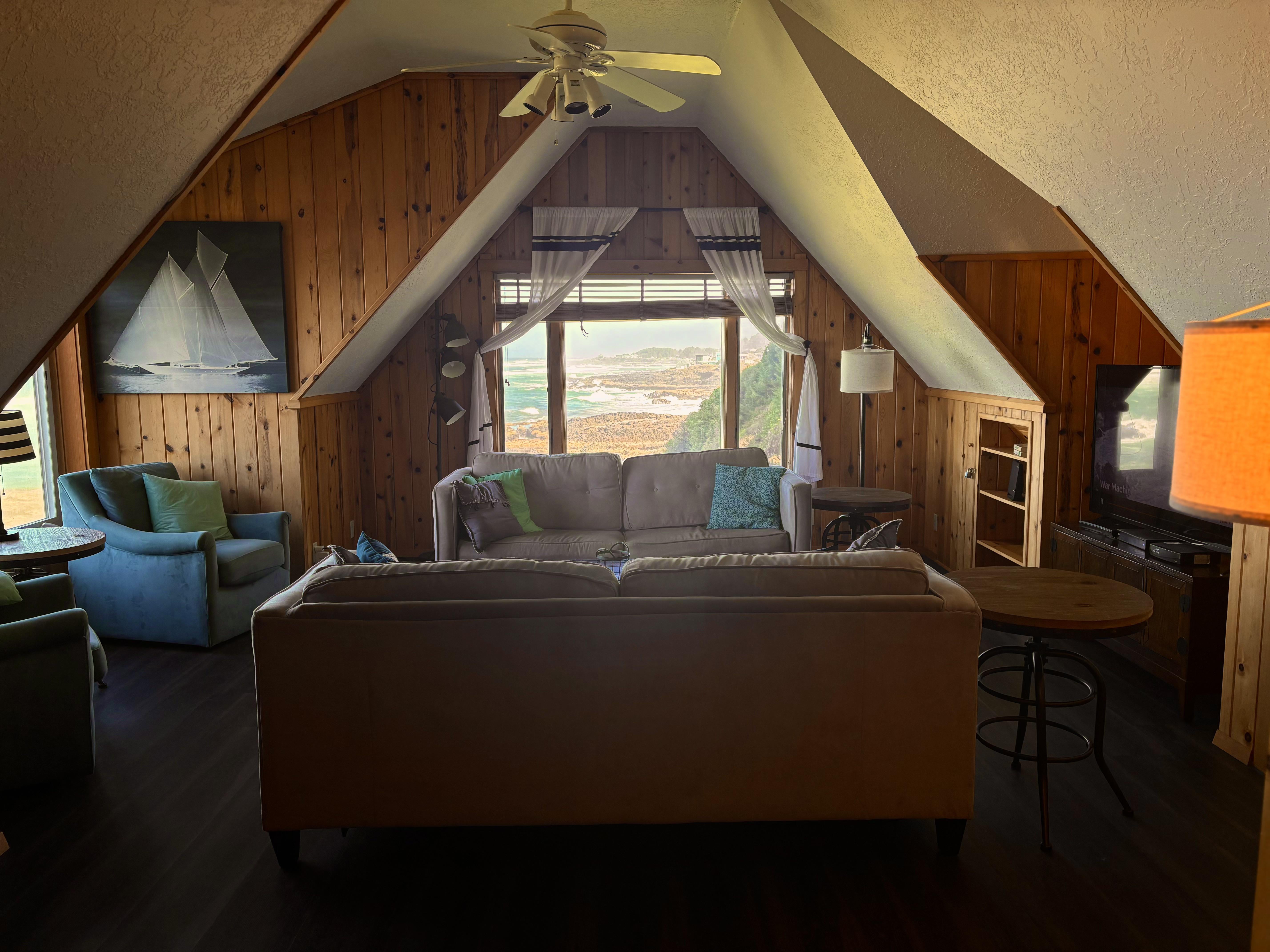 オレゴンコーストにあるこの居心地の良いリビングルーム。