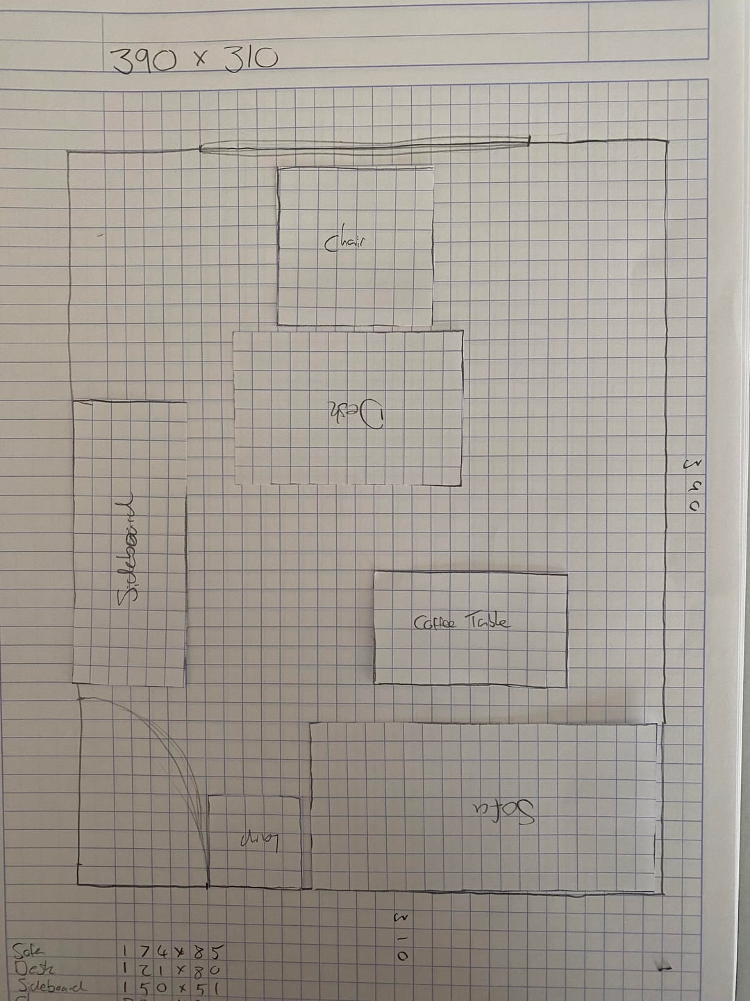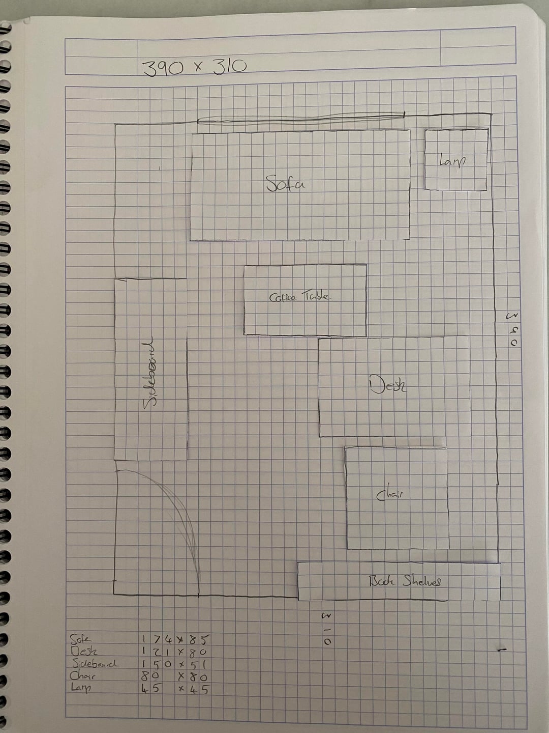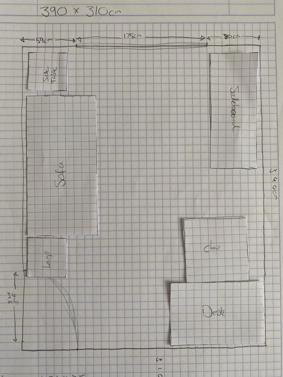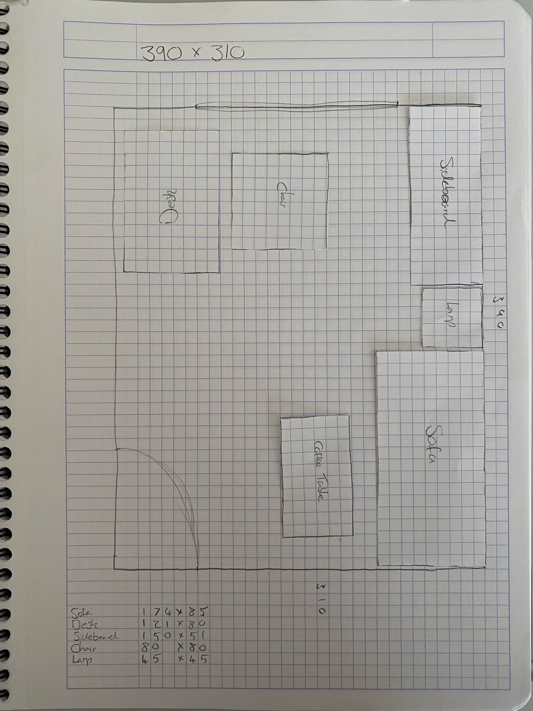 現在のレイアウトの部屋の写真、寸法を示す図面、および私が検討しているレイアウトのアイデアを添付しました。