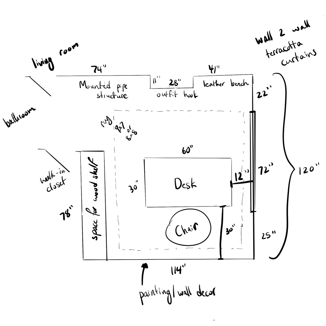 このスペースはおよそ 10 フィート x 10 フィートで、天井は 9.5 フィートですが、いくつかの癖があり、通常の 10 フィート x 10 フィートよりも計画が難しくなります。部屋のレイアウトのアイデアを2枚目の写真にまとめました。