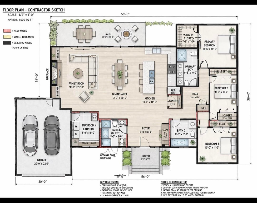 新しい家を購入しましたが、現在の間取りは最適ではありません。これには意味がありますか?ファミリールーム/ダイニングルーム/キッチンはオープンコンセプトすぎるでしょうか??寝室を追加するために玄関ドアを移動することになりました。