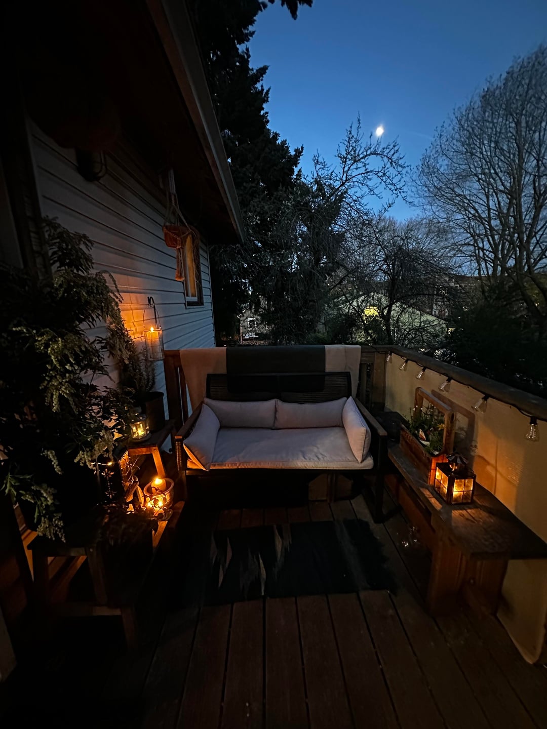 我が家の小さなベランダを、小さな居心地の良い空間に変えてみませんか。夕暮れ、昼も夜も。