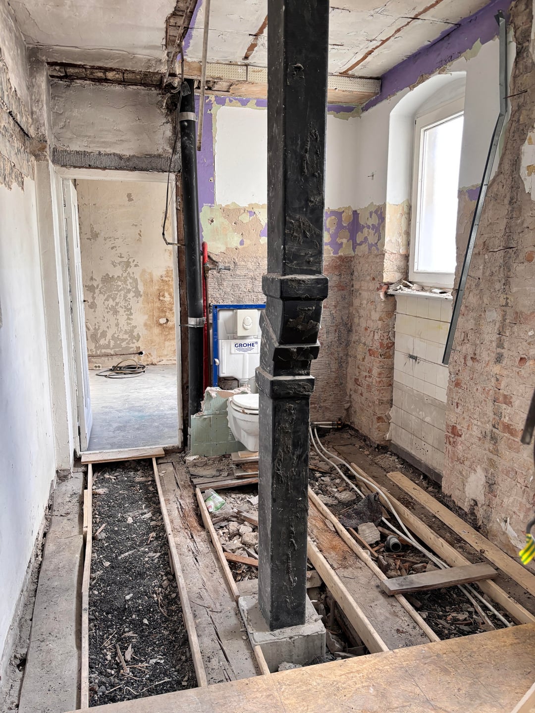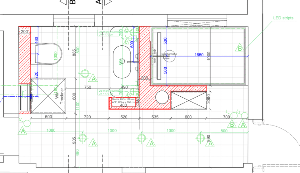 現在、トイレと洗面化粧台の間に埋め込み式スポットライトが 1 つあります。私たちのプランナーは、壁取り付け用燭台と洗面化粧台に温かみのあるバックライト付きの鏡があれば、スポットライトは 1 つで十分だと言いました。