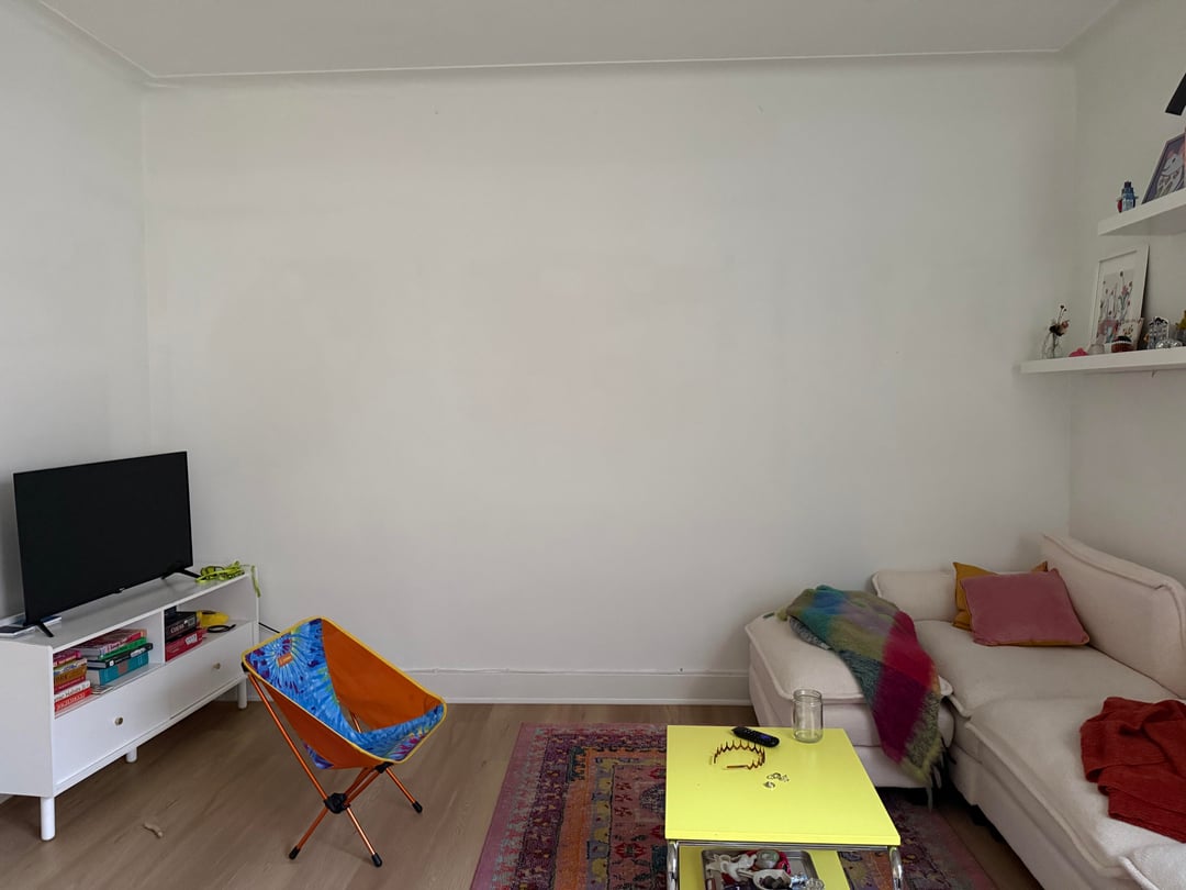 私たちはソファのバリエーションをいくつか試しましたが、この壁に寄せるのが一番良いように思えますが、ソファとテレビの間にはまだデッドスペースがたくさんあります (確かに、テレビはそのスペースに対して小さすぎますが、私たちは手持ちのもので作業しています 😅)